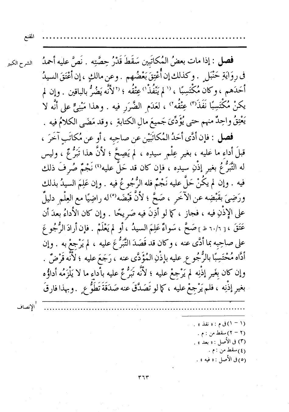 فصل: إذا مات بعضُ المُكاتَبِين سَقَطَ قَدْرُ حِصَّتِه. نَصَّ عليه أحمدُ في رِوَايَةِ حَنْبَلٍ. وكذلك إن أُعْتِقَ بَعْضُهم. وعن مالكٍ، إن أعْتَقَ السيدُ أحَدَهم، وكان مُكْتَسِبًا، [لم يَنْفُذْا] (¬1) عِتْقُه؛ [لأنَّه يَضُرُّ بالباقين. وإن لم يكنْ مُكْتَسِبًا نَفَذَ (¬2) عِتْقُه] (¬3)، لعَدَمِ الضَّرَرِ فيه. وهذا مَبْنِيٌّ على أنَّه لا يَعْتِقُ واحِدٌ منهم حتى يُؤَدِّيَ جَميعَ مالِ الكتابةِ، وقد مَضَى الكلامُ فيه.