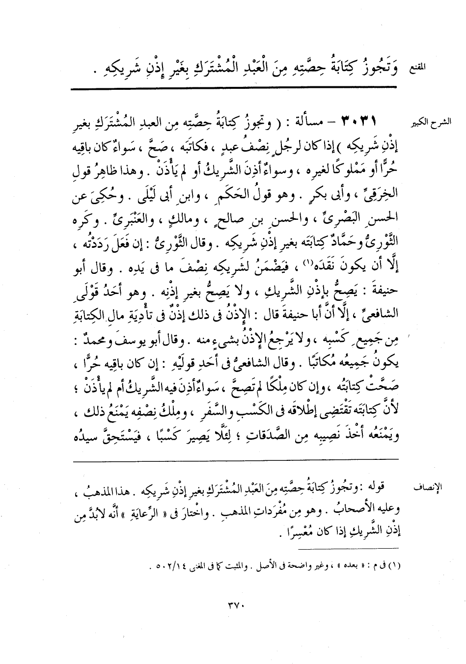 قوله: وتجُوزُ كِتابَةُ حِصَّتِه مِنَ العَبْدِ المُشْتَرَكِ بغيرِ إذْنِ شَرِيكِه. هذا المذهبُ، وعليه الأصحابُ. وهو مِن مُفْرَداتِ المذهبِ. واخْتارَ في «الرعايَةِ» أنَّه لابُدَّ مِن إذْنِ الشَّرِيكِ إذا كان مُعْسِرًا.