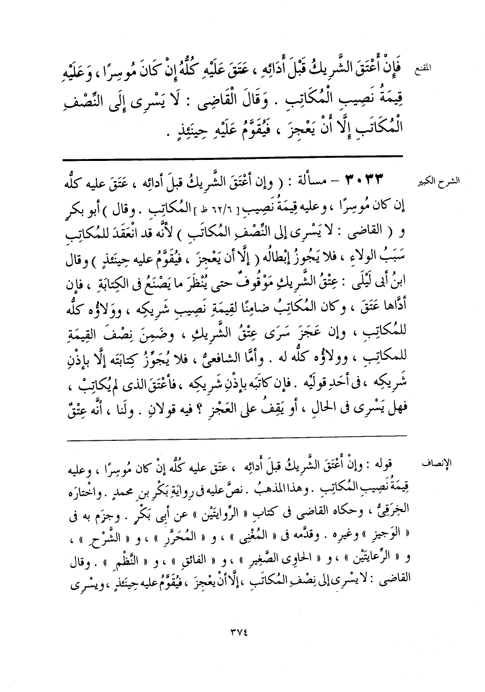 قوله: وإنْ أَعْتَقَ الشَّرِيكُ قبلَ أَدائِه، عتَق عليه كُلُّه إنْ كان مُوسِرًا، وعليه قِيمَةُ نَصِيبِ المُكاتِبِ. وهذا المذهبُ. نصَّ عليه في رِوايَةِ بَكْرِ بنِ محمدٍ. واخْتارَه الخِرَقِيُّ، وحكاه القاضي في كتابِ «الرِّوايتَين» عن أبي بَكْرٍ. وجزَم به في «الوَجيزِ» وغيرِه. وقدَّمه في «المُغْنِي»، و «المُحَرَّرِ»، و «الشَّرْحِ»، و «الرِّعايتَين»، و «الحاوي الصَّغِيرِ»، و «الفائقِ»، و «النَّظْمِ». وقال القاضي: لا يسْرِي إلى نِصْفِ المُكاتَبِ، إلَّا أنْ يعْجِزَ، فيُقَوَّمُ عليه حِينَئذٍ، ويسْرِي