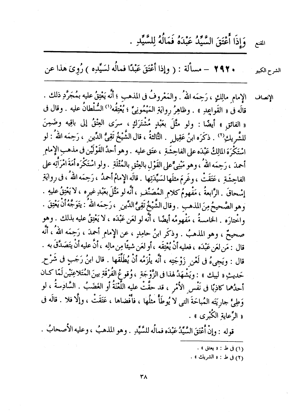 الإمامِ مالكٍ، رَحِمَه اللهُ. والمَعْروفُ في المذهبِ؛ أَنه يَعْتِقُ عليه بمُجَرَّدِ ذلك. قاله في «القَواعدِ». وظاهِرُ رِوايَةِ المَيمُونِيِّ، يُعْتِقُه (¬1) السُّلْطانُ عليه. وقال في «الفائقِ» أيضًا: ولو مثَّلَ بعَبْدٍ مُشْتَرَكٍ، سرَى العِتْقُ إلى باقِيه وضَمِنَ للشَّرِيكِ (¬2). ذكَرَه ابنُ عَقِيلٍ. الثَّالثةُ، قال الشَّيخُ تَقِيُّ الدِّينِ، رَحِمَه اللهُ: لو اسْتَكْرَهَ المالِكُ عَبْدَه على الفاحِشةِ، عتَق عليه. وهو أحدُ القَوْلَين في مذهبِ الإِمامِ أحمدَ، رَحِمَه اللهُ، وهو مَبْنِيٌّ على القَوْلِ بالعِتْقِ بالمُثْلَةِ. ولو اسْتَكْرَه أمَةَ امْرَأَتِه على الفاحِشَةِ، عَتَقَتْ، وغَرِمَ مثلَها لسَيِّدَتِها. قاله الإمامُ أحمدُ، رَحِمَه اللهُ، في رِوايَةِ إسْحاقَ. الرَّابعةُ، مَفْهومُ كلامِ المُصَنِّفِ، أنَّه لو مَثَّلَ بعَبْدِ غيرِه، لا يَعْتِقُ عليه. وهو الصَّحيحُ مِنَ المذهبِ. وقال الشَّيخُ تَقِيُّ الدِّينِ، رَحِمَه اللهُ: يتَوَجَّهُ أنْ يَعْتِقَ. واخْتارَه. الخامسةُ، مَفْهومُه أيضًا، أنَّه لو لعَن عَبْدَه، لا يَعْتِقُ عليه بذلك. وهو صحيحٌ، وهو المذهبُ. وذكَر ابنُ حامِدٍ، عن الإمامِ أحمدَ، رَحِمَه اللهُ، أَنه قال: مَن لعَن عَبْدَه، فعليه أنْ يُعْتِقَه، أو لعَن شيئًا مِن مالِه، أنَّ عليه أنْ يتَصَدَّقَ به. قال: ويَجِئُ في لَعْنِ زَوْجَتِه، أنَّه يلْزَمُه أنْ يُطَلِّقَها. قال ابنُ رَجَبٍ في شَرْحِ حَديثِ «ليبك»: ويَشْهَدُ لهذا في الزَّوْجَةِ، وُقوعُ الفُرْقَةِ بينَ المُتَلاعِنَين لَمّا كان أحدُهما كاذِبًا في نَفْسِ الأمْرِ، قد حقَّتْ عليه اللَّعْنَةُ أو الغَضَبُ. السَّادِسةُ، لو وَطيء جارِيَتَه المُباحَةَ التي لا يُوطَأُ مثلُها، فأفْضاها، عَتَقَتْ، وإلَّا فلا. قاله في «الرِّعايةِ الكُبْرى».