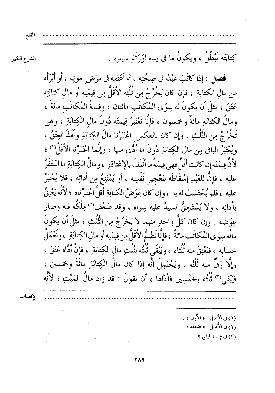 فصل: إذا كاتَبَ عَبْدًا في صِحَّتِه، ثم أعْتَقَه في مرَضِ موتِه، أو أبْرَأه مِن مالِ الكتابةِ، فإن كان يَخْرُجُ مِن ثُلُثِه الأقَلُّ مِن قِيمَتِه أو مالِ كتابَتِه عَتَقَ، مثلَ أن يكونَ له سِوَى المُكاتَبِ مائتان، وقِيمةُ المُكاتَبِ مائةٌ، ومالُ الكتابَةِ مائةٌ وخمسون، فإنَّا نَعْتَبرُ قِيمتَه دُونَ مالِ الكِتابَةِ، وهي تَخْرُجُ مِن الثُّلُثِ. وإن كان بالعكسِ اعْتَبَرْنا مال الكِتابَةِ ونَفَذَ العِتْقُ، ويُعْتَبَرُ الباقي مِن مالِ الكِتابَةِ دُونَ ما أدَّى منها، وإنَّما اعْتَبَرْنا الأقَلَّ (¬1)؛ لأنَّ قِيمَتَه إن كانت أقَلَّ فهي قِيمَةُ ما أتْلَفَ بالإِعْتاقِ, ومالُ الكِتابَةِ ما اسْتَقَرَّ عليه, فإنَّ للعَبْدِ إسْقَاطَه بتَعْجِيزِ نَفْسِه, أو يَمْتَنِعُ مِن أدائِه, فلا يُجْبَرُ عليه، فلم يُحْتَسَبْ له به، وإن كان عِوَضُ الكِتابَةِ أقلَّ اعْتَبَرْناه؛ لأنَّه يَعْتِقُ بأدائِه، ولا يَسْتَحِقُّ السيدُ عليه سِواه، وقد ضَعُف (¬2) مِلْكُه فيه وصار عِوَضَه. وإن كان كلُّ واحدٍ منهما لا يَخْرُجُ مِن الثُّلُثِ، مثلَ أن يكونَ مالُه سِوَى المُكاتَبِ مائةً، فإنَّا نَضُمُّ الأقَلَّ مِن قِيمَتِه أو مالِ الكِتابَةِ، ونَعْمَلُ بحسابِه، فيَعْتِقُ منه ثُلُثاه، ويَبْقَى ثُلُثُه بثُلُثِ مالِ الكِتابةِ، فإنْ أدَّاه عَتَقَ، وإلَّا رَقَّ منه ثُلُثُه. ويَحْتَمِلُ أنَّه إذا كان مالُ الكِتابَهِّ مائَةً وخمسين، فيَبْقَى (¬3) ثُلُثُه بخَمْسِين فأدَّاها، أن نقولَ: قد زاد مالُ المَيِّتِ؛ لأنَّه