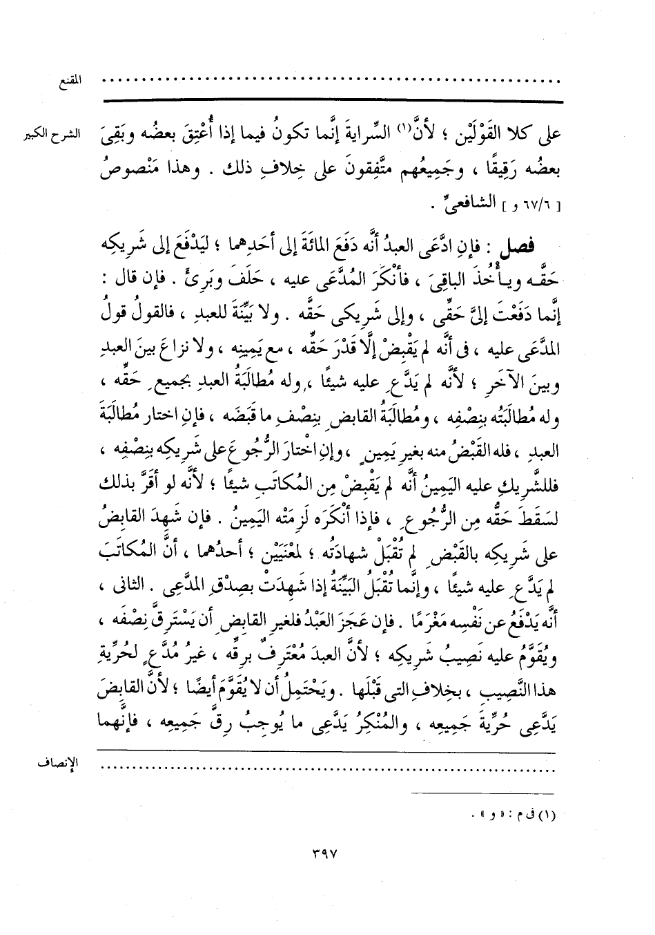 فصل: فإنِ ادَّعَى العبدُ أنَّه دَفَعَ المائَةَ إلى أحَدِهما؛ ليَدْفَعَ إلى شَرِيكِه حَقَّه ويأْخُذَ الباقِيَ، فأنْكَرَ المُدَّعَى عليه، حَلَفَ وبَرِئَ. فإن قال: إنَّما دَفَعْتَ إليَّ حَقِّي، وإلى شَرِيكي حَقَّه. ولا بَيِّنَةَ للعبدِ، فالقولُ قولُ المدَّعَى عليه، في أنَّه لم يَقْبِضْ إلَّا قَدْرَ حَقِّه، مع يَمِينِه، ولا نزاعَ بينَ العبدِ وبينَ الآخَرِ؛ لأنَّه لم يَدَّعِ عليه شيئًا، وله مُطالبَةُ العبدِ بجميعِ حَقِّه، وله مُطالبَتُه بنِصْفِه، ومُطالبَةُ القابضِ بنِصْفِ ما قَبَضَه، فإنِ اختار مُطالبَةَ العبدِ، فله القَبْضُ منه بغيرِ يَمِينٍ، وإنِ اخْتارَ الرُّجُوعَ على شَرِيكِه بنِصْفِه، فللشَّرِيكِ عليه اليَمِينُ أنَّه لم يَقْبِضْ مِن المُكاتَبِ شيئًا؛ لأنَّه لو أقَرَّ بذلك لسَقَطَ حَقُّه مِن الرُّجُوعِ، فإذا أنْكَرَه لَزِمَتْه اليَمِينُ. فإن شَهِدَ القابِضُ على شَرِيكِه بالقَبْضِ لم تُقْبَلْ شهادَتُه؛ لمعْنَيَين؛ أحدُهما، أنَّ المُكاتَبَ لم يَدَّعِ عليه شيئًا، وإنَّما تُقْبَلُ البَيِّنَةُ إذا شَهِدَت بصِدْقِ المدَّعِي. الثَّاني، أنَّه يَدْفعُ عن نَفْسِه مَغْرَمًا. فإن عَجَزَ العَبْدُ فلغيرِ القابِضِ أن يَسْتَرِقَّ نِصْفَه، ويُقَوَّمُ عليه نَصِيبُ شَرِيكِه؛ لأنَّ العبدَ مُعْتَرِفٌ برِقِّه، غيرُ مُدَّعٍ لحُرِّيةِ هذا النَّصِيبِ، بخِلافِ التي قَبْلَها. ويَحْتَمِلُ أن لا يُقَوَّمَ أيضًا؛ لأنَّ القابضَ يَدَّعِي حُرِّيةَ جَمِيعِه، والمُنْكِرُ يَدَّعِي ما يُوجِبُ رِقَّ جَمِيعِه، فإنَّهما