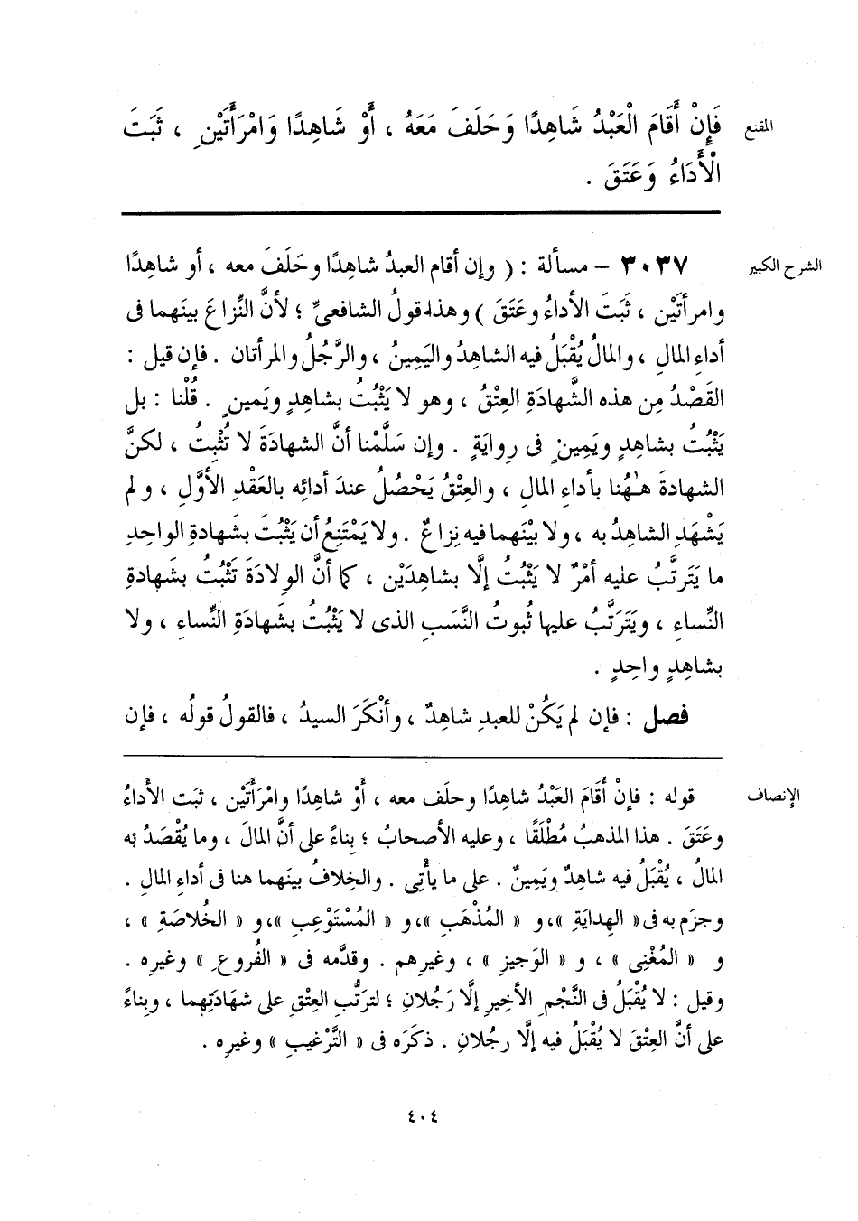 قوله: فإنْ أَقَامَ العَبْدُ شاهِدًا وحلَف معه، أَوْ شاهِدًا وامْرَأَتَين، ثبَت الأَداءُ وعَتَقَ. هذا المذهبُ مُطْلَقًا، وعليه الأصحابُ، بِناءً على أنَّ المال، وما يُقْصَدُ به المالُ، يُقْبَلُ فيه شاهِدٌ ويَمِينٌ. على ما يأْتِي. والخِلافُ بينَهما هنا في أداءِ المالِ. وجزَم به في «الهِدايَةِ»، و «المُذْهَبِ»، و «المُسْتَوْعِبِ»، و «الخُلاصَةِ»، و «المُغْنِي»، و «الوَجيزِ»، وغيرِهم. وقدَّمه في «الفُروعِ» وغيرِه. وقيل: لا يُقْبَلُ في النَّجْمِ الأخِيرِ إلَّا رَجُلانِ؛ لترَتُّبِ العِتْقِ على شهَادَتِهما، وبِناءً على أنَّ العِتْقَ لا يُقْبَلُ فيه إلَّا رجُلانِ. ذكَرَه في «التَّرْغيبِ» وغيرِه.