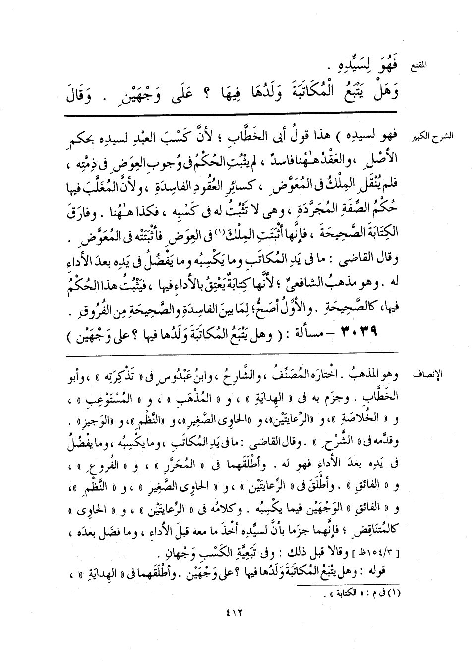 قوله: وهل يتْبَعُ المُكاتَبَةَ وَلَدُها فيها؟ على وَجْهَين. وأطْلَقَهما في «الهِدايَةِ»،