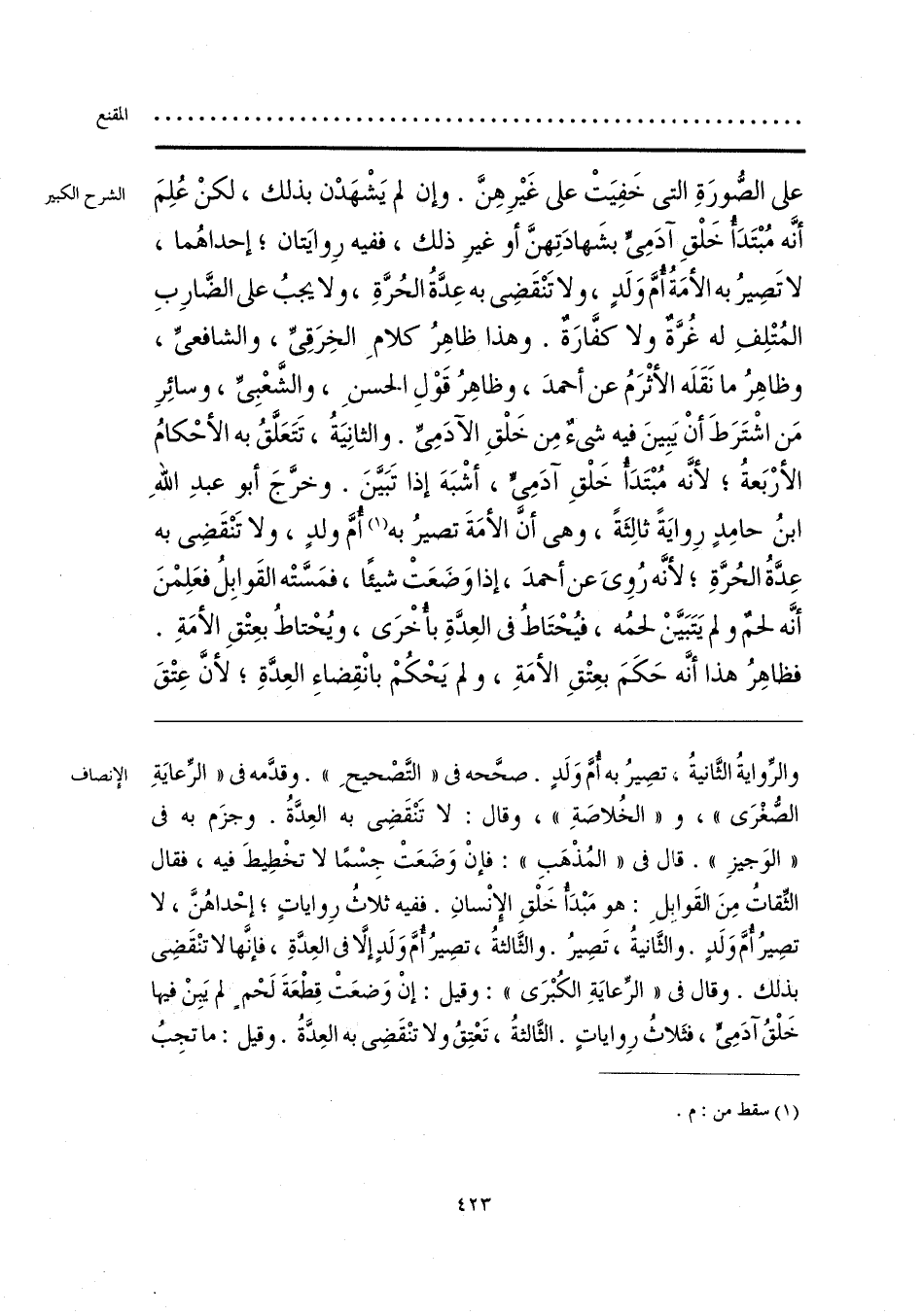 والرِّوايةُ الثَّانيةُ، تصِيرُ به أُمَّ وَلَدٍ. صحَّحه في «التَّصْحيحِ». وقدَّمه في «الرِّعايَةِ الصُّغْرَى»، و «الخُلاصَةِ»، وقال: لا تَنْقَضي به العِدَّةُ. وجزَم به في «الوَجيزِ». قال في «المُذْهَبِ»: فإنْ وَضَعَتْ جِسْمًا لا تخْطِيطَ فيه، فقال الثِّقاتُ مِنَ القَوابلِ: هو مَبْدأُ خَلْقِ الإِنْسانِ. ففيه ثلاثُ رِواياتٍ؛ إحْداهُنَّ، لا تصِيرُ أُمَّ وَلَدٍ. والثَّانيةُ، تَصِيرُ. والثَّالثةُ، تصِيرُ أُمَّ وَلَدٍ إلَّا في العِدَّةِ، فإنَّها لا تنْقَضِي بذلك. وقال في «الرِّعايَةِ الكُبْرَى»: وقيل: إنْ وَضعَتْ قِطْعَةَ لَحْمٍ لم يَبِنْ فيها خَلْقُ آدَمِيٍّ، فثَلاثُ رِواياتٍ. الثَّالثةُ، تَعْتِقُ ولا تنْقَضِي به العِدَّةُ. وقيل: ما تجِبُ