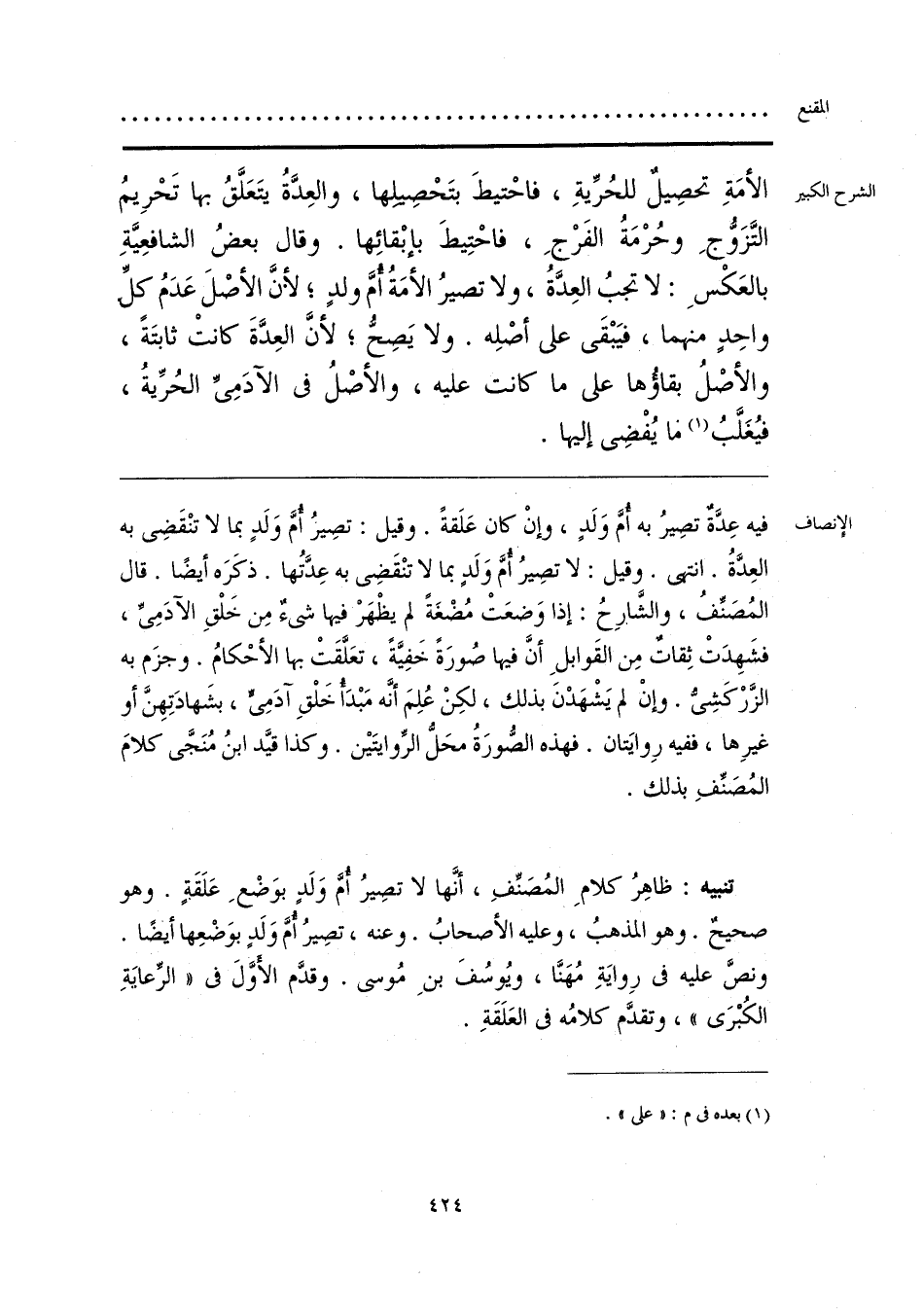 تنبيه: ظاهِرُ كلامِ المُصَنِّفِ، أنَّها لا تصِيرُ أُمَّ وَلَدٍ بوَضْعِ عَلَقَةٍ. وهو صحيحٌ. وهو المذهبُ، وعليه الأصحابُ. وعنه، تصِيرُ أُمَّ وَلَدٍ بوَضْعِها أيضًا. ونصَّ عليه في رِوايَةِ مُهَنَّا، ويُوسُفَ بنِ مُوسى. وقدَّم الأوَّلَ في «الرِّعايَةِ الكُبْرَى»، وتقدَّم كلامُه في العَلَقَةِ.