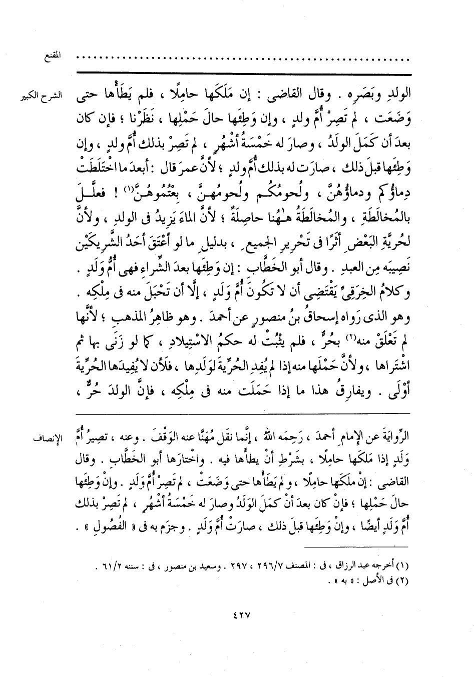 الرِّوايَةَ عن الإِمامِ أحمدَ، رَحِمَه الله، إنَّما نقَل مُهَنَّا عنه الوَقْفَ. وعنه، تصِيرُ أُمَّ وَلَدٍ إذا مَلكَها حامِلًا، بشَرْطِ أنْ يطأْها فيه. واخْتارَها أبو الخَطَّابِ. وقال القاضي: إنْ ملَكَها حامِلًا، ولم يَطَأَها حتى وَضَعَتْ، لم تَصِرْ أُمَّ ولَدٍ. وإنْ وَطِئَها حال حَمْلِها؛ فإنْ كان بعدَ أنْ كمَلَ الوَلَدُ وصارَ له خَمْسَةُ أشْهُرٍ، لم تَصِرْ بذلك أُمَّ وَلَدٍ أيضًا، وإنْ وَطِئَها قبلَ ذلك، صارَتْ أُمَّ وَلَدٍ. وجزَم به في «الفُصُولِ».