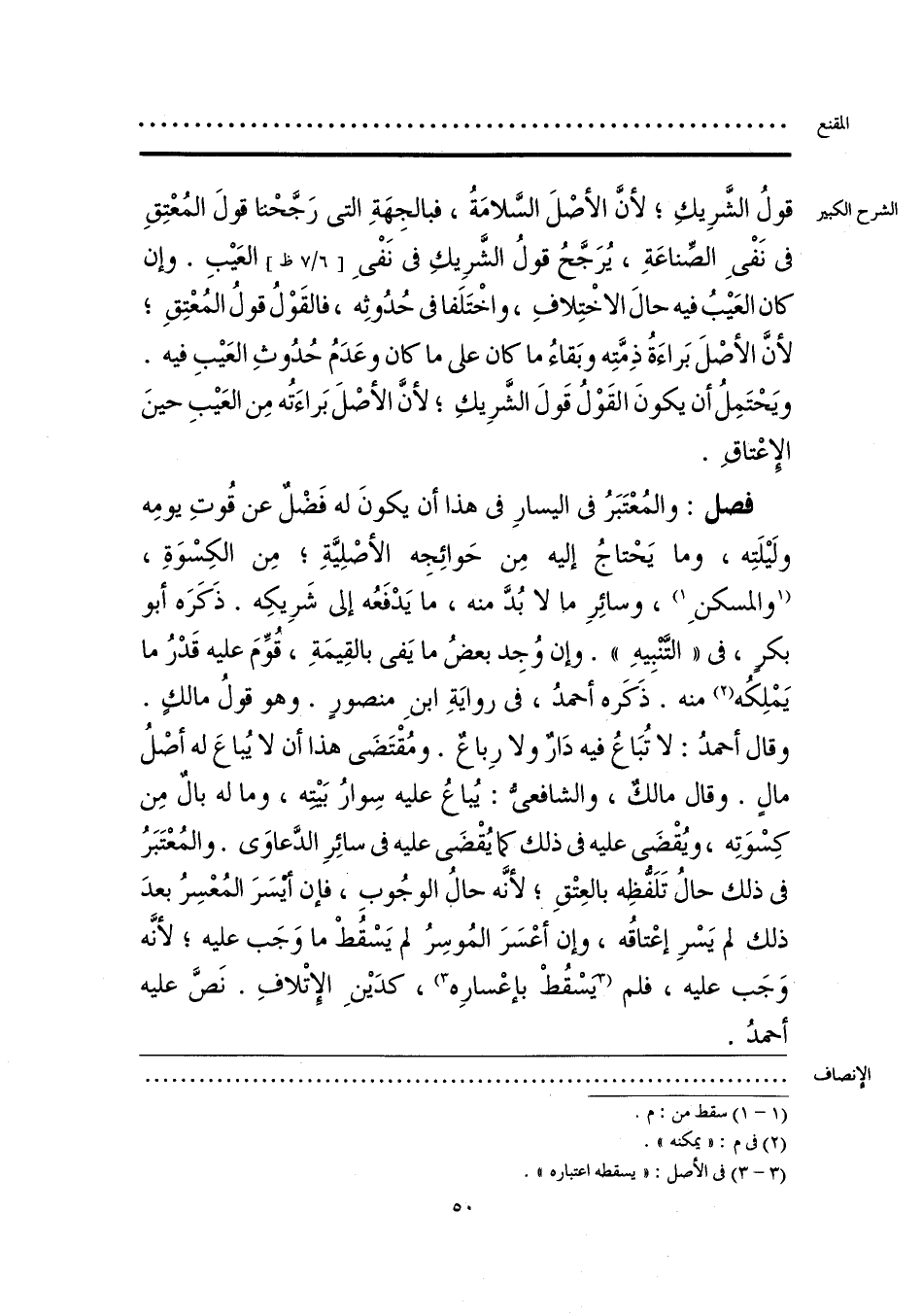 فصل: والمُعْتَبَرُ في اليسارِ في هذا أنَّ يكونَ له فَضْلٌ عن قُوتِ يومِه ولَيلَتِه، وما يَحْتاجُ إليه مِن حَوائِجِه الأصْلِيَّةِ؛ مِن الكِسْوَةِ، [والمسكنِ] (¬1)، وسائِرِ ما لا بُدَّ منه، ما يَدْفَعُه إلى شَرِيكِه. ذَكَرَه أبو بكرٍ، في «التَّنْبِيهِ». وإن وُجِد بعضُ ما يَدْفَعُه بالقِيمَةِ، قُوِّمَ عليه قَدْرُ ما يَمْلِكُه (¬2) منه. ذَكَره أحمدُ، في روايَةِ ابنِ منصورٍ. وهو قولُ مالكٍ. وقال أحمدُ: لا تُبَاعُ فيه دَارٌ ولا رِباعٌ. ومُقْتَضَى هذا أنَّ لا يُباعَ له أصْلُ مالٍ. وقال مالكٌ، والشافعيُّ: يُباعُ عليه سِوارُ بَيته، وما له بالٌ مِن كِسْوَتِه، ويُقْضَى عليه في ذلك كما يُقْضَى عليه في سائِرِ الدَّعاوَى. والمُعْتَبَرُ في ذلك حالُ تَلَفُّظِه بالعِتْقِ؛ لأنَّه حالُ الوجُوبِ، فإن أيسَرَ المُعْسِرُ بعدَ ذلك لم يَسْرِ إعْتاقُه، وإن أعْسَرَ المُوسِرُ لم يَسْقُطْ ما وَجَب عليه؛ لأنَّه وَجَب عليه، فلم [يسْقُطْ بإعْسارِه] (¬3)، كدَينِ الإِتْلافِ. نَصَّ عليه أحمدُ.