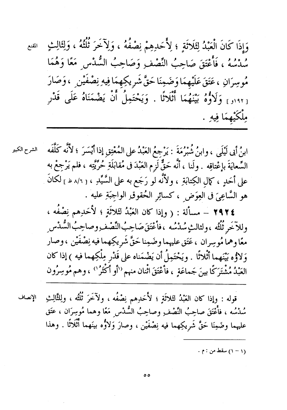 قوله: وإذا كان العَبْدُ لثَلاثَةٍ؛ لأحَدِهم. نِصْفُه، ولآخَرَ ثُلُثُه، ولِلثالِثِ سُدْسُه، فأعْتَقَ صاحِبُ النِّضفِ وصاحِبُ السُّدْسِ مَعًا. وهما مُوسِرَان، عتَق عليهما وضَمِنَا حَق شَرِيكِهما فيه نِصْفَين، وصارَ وَلاوه بينَهما أثْلَاثًا. وهذا