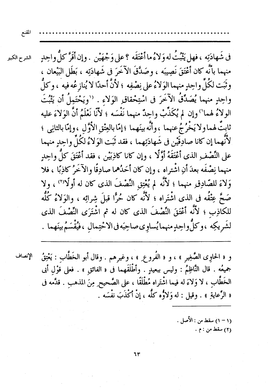 و «الحاوي الصَّغِيرِ»، و «الفُروعِ»، وغيرِهم. وقال أبو الخَطَّابِ: يَعْتِقُ جميعُه. قال النَّاظِمُ: وليس ببعيدٍ. وأطْلَقَهما في «الفائقِ». فعلى قوْلِ أبي الخَطَّابِ، لا وَلاء له فيما اشْتَراه مُطْلَقًا، على الصَّحيحِ مِنَ المذهبِ. قدَّمه في «الرِّعايةِ». وقيل: له وَلاؤُه كلُّه، إنْ أكْذَبَ نفْسَه.