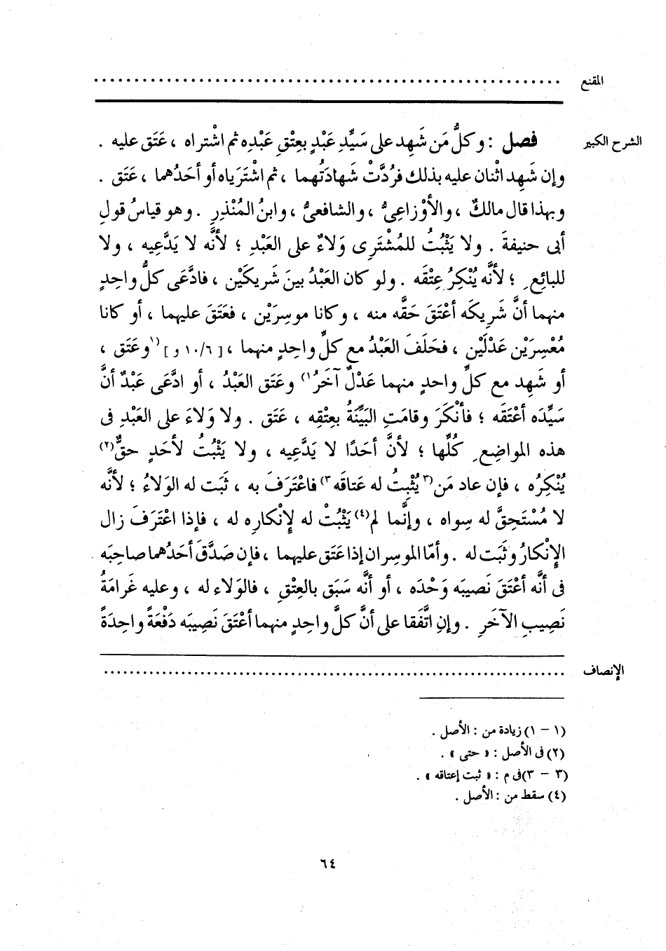 فصل: وكلُّ مَن شَهِد على سَيِّدِ عَبْدٍ بعِتْقِ عَبْدِه ثم اشْتراه، عَتَق عليه. وإن شَهِد اثْنان عليه بذلك فرُدَّتْ شَهادَتُهما، ثم اشْتَرَياه أو أحَدُهما، عَتَق. وبهذا قال مالكٌ، والأوْزاعِيُّ، والشافعيُّ، وابنُ المُنْذِرٍ. وهو قياسُ قولِ أبي حنيفةَ. ولا يَثْبُتُ للمُشْتَرِي وَلاءٌ على العَبْدِ؛ لأنَّه لا يَدَّعِيه، ولا للبائِعِ؛ لأنَّه يُنْكِرُ عِتْقَه. ولو كان العَبْدُ بينَ شَريكَين، فادَّعَى كلُّ واحِدٍ منهما أنَّ شَرِيكَه أعْتَقَ حَقَّه منه، وكانا موسِرَين، فعَتَقَ عليهما، أو كانا مُعْسِرَين عَدْلَين، فحَلَفَ العَبْدُ مع كلِّ واحِدٍ منهما، [وعَتَق، أو شَهِد مع كلِّ واحدٍ منهما عَدْلٌ آخَرُ] (¬1) وعَتَق العَبْدُ، أو ادَّعَى عَبْدٌ أنَّ سَيِّدَه أعْتَقَه؛ فأنْكَرَ وقامَتِ البَيِّنَةُ بعِتْقِه، عَتَق. ولا وَلاءَ على العَبْدِ في هذه المواضِعِ كُلِّها؛ لأنَّ أحَدًا لا يَدَّعِيه، ولا يَثْبُتُ لأحَدٍ حقٌّ (¬2) يُنْكِرُه، فإن عاد مَن [يُثْبتُ له عَتاقَه] (¬3) فاعْتَرَفَ به، ثَبَت له الوَلاءُ؛ لأنَّه لا مُسْتَحِقَّ له سِواه، وإنَّما لم (¬4) يَثْبُتْ له لإِنْكارِه له، فإذا اعْتَرَفَ زال الإنْكارُ وثَبَت له. وأمّا الموسِران إذا عَتَق عليهما، فإن صَدَّقَ أحَدُهما صاحِبَه. في أنَّه أعْتَقَ نَصيبَه وَحْدَه، أو أنَّه سَبَق بالعِتْقِ، فالوَلاء له، وعليه غَرامَةُ نَصِيبِ الآخَرِ. وإنِ اتَّفَقا على أنَّ كلَّ واحِدٍ منهما أعْتَقَ نَصِيبَه دَفْعَةً واحِدَةً