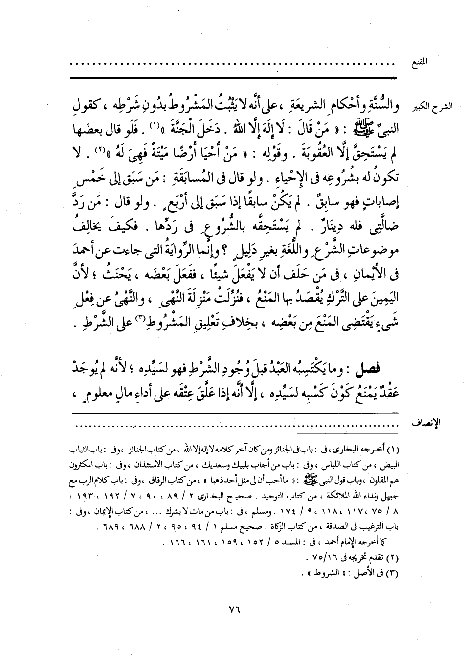 والسُّنَّةِ وأحْكامِ الشريعَةِ، على أنَّه لا يَثْبُتُ المَشْرُوطُ بدُونِ شَرْطِه، كقولِ النبيِّ - صلى الله عليه وسلم -: «مَنْ قَال: لَا إِلَهَ إلا اللهُ. دَخَلَ الْجَنَّةَ» (¬1). فَلَو قال بعضَها لم يَسْتَحِقَّ إلَّا العُقُوبَةَ. وقَوْلِه: «مَنْ أَحْيَا أَرْضًا مَيتَةً فَهِيَ لَهُ» (¬2). لا تكونُ له بشُرُوعِه في الإِحْياءِ. ولو قال في المُسابَقَةِ: مَن سَبَق إلى خَمْسِ إصاباتٍ فهو سابِقٌ. لم يَكُنْ سابقًا إذا سَبَق إلى أرْبَعٍ. ولو قال: مَن رَدَّ ضالَّتِي فله دِينَارٌ. لم يَسْتَحِقَّه بالشُّرُوعِ في رَدِّها. فكيف يخالِفُ موضوعاتِ الشَّرْعِ واللُّغَةِ بغيرِ دَلِيلٍ؟ وإنَّما الرِّوايَةُ التي جاءت عن أحمدَ في الأيمانِ، في مَن حَلَف أن لا يَفْعَلَ شيئًا، ففَعَلَ بَعْضَه، يَحْنَثُ؛ لأنَّ اليَمِينَ على التَّرْكِ يُقْصَدُ بها المَنْعُ، فنُزِّلَتْ مَنْزِلَةَ النَّهْي، والنَّهْيُ عن فِعْلِ شَيءٍ يَقْتَضِي المَنْعَ مِن بَعْضِه، بخِلافِ تَعْلِيقِ المَشْرُوط (¬3) على الشَّرْطِ.