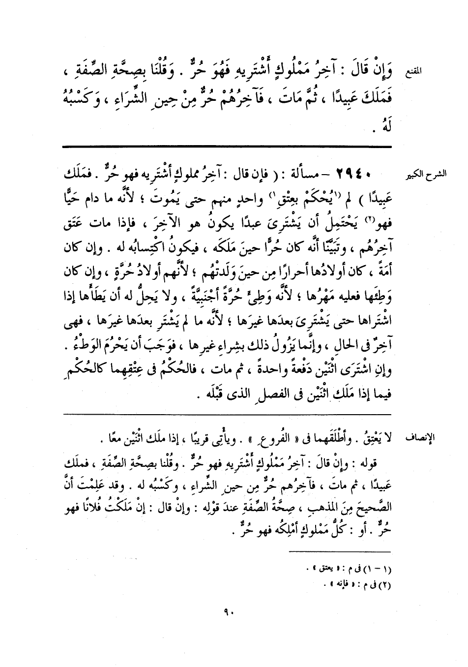 قوله: وإِنْ قال: آخِرُ مَمْلُوكٍ أَشْتَرِيهِ فهو حُرٌّ. وقُلْنا بصِحَّةِ الصِّفَةِ، فملَك عَبيدًا، ثم ماتَ، فآخِرُهم حُرٌّ مِن حينِ الشِّراءِ، وكَسْبُه له. وقد عَلِمْتَ أنَّ الصَّحيحَ مِنَ المذهبِ، صِحَّةُ الصِّفَةِ عندَ قوْلِه: وإنْ قال: إنْ مَلَكْتُ فُلانًا فهو حُرٌّ. أو: كُلُّ مَمْلوكٍ أمْلِكُه فهو حُرٌّ.