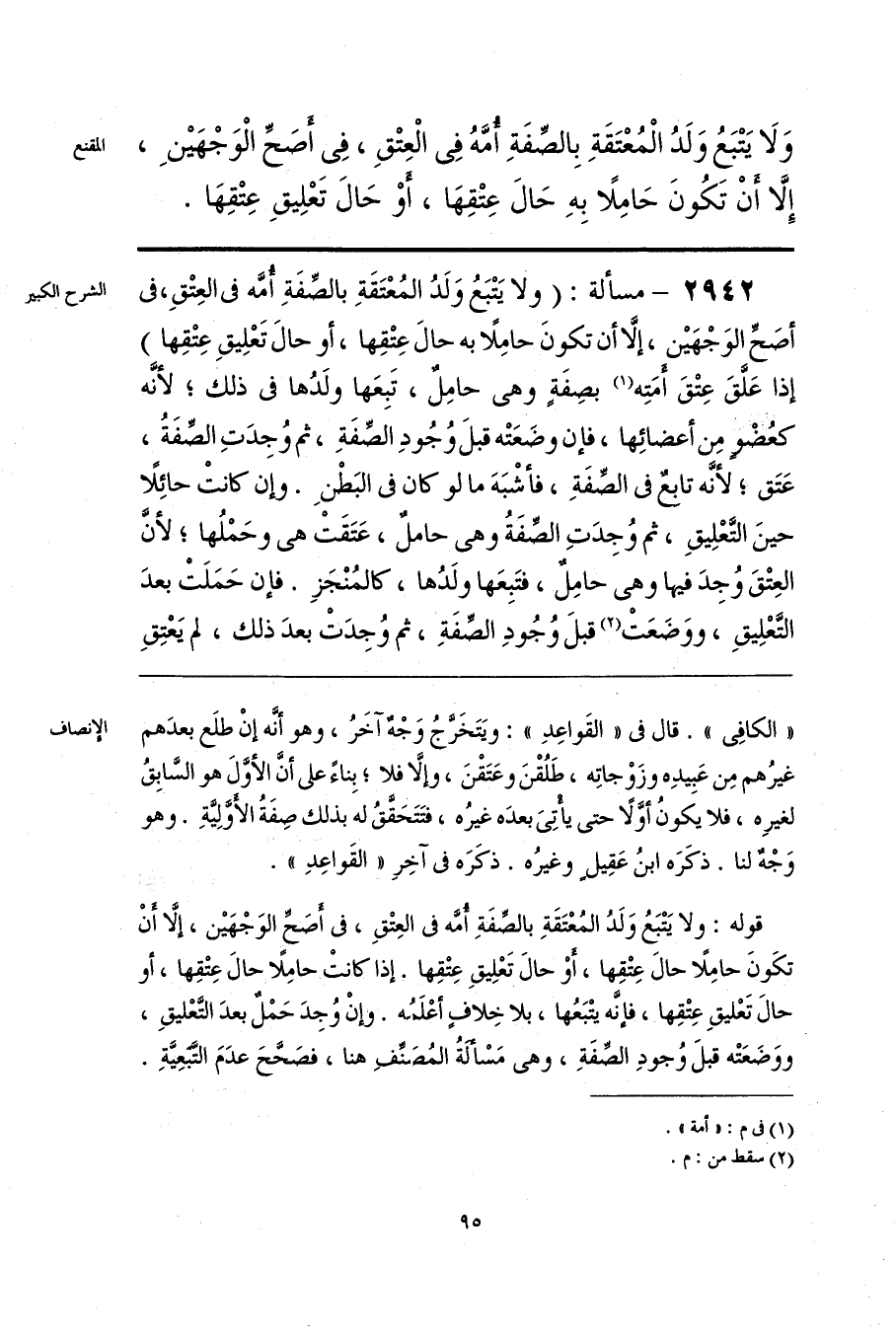 قوله: ولا يَتْبَعُ وَلَدُ المُعْتَقَةِ بالصِّفَةِ أُمَّه في العِتْقِ، في أَصَحِّ الوَجْهَين، إلَّا أَنْ تكَونَ حامِلًا حال عِتْقِها، أَوْ حال تَعْلِيقِ عِتْقِها. إذا كانتْ حامِلًا حال عِتْقِها، أو حال تَعْليقِ عِتْقِها، فإنه يتْبَعُها، بلا خِلافٍ أعْلَمُه. وإنْ وُجِدَ حَمْلٌ بعدَ التَّعْليقِ، ووَضَعَتْه قبلَ وُجودِ الصِّفَةِ، وهي مَسْألَةُ المُصَنِّفِ هنا، فصَحَّحَ عدَمَ التَّبَعِيَّةِ.