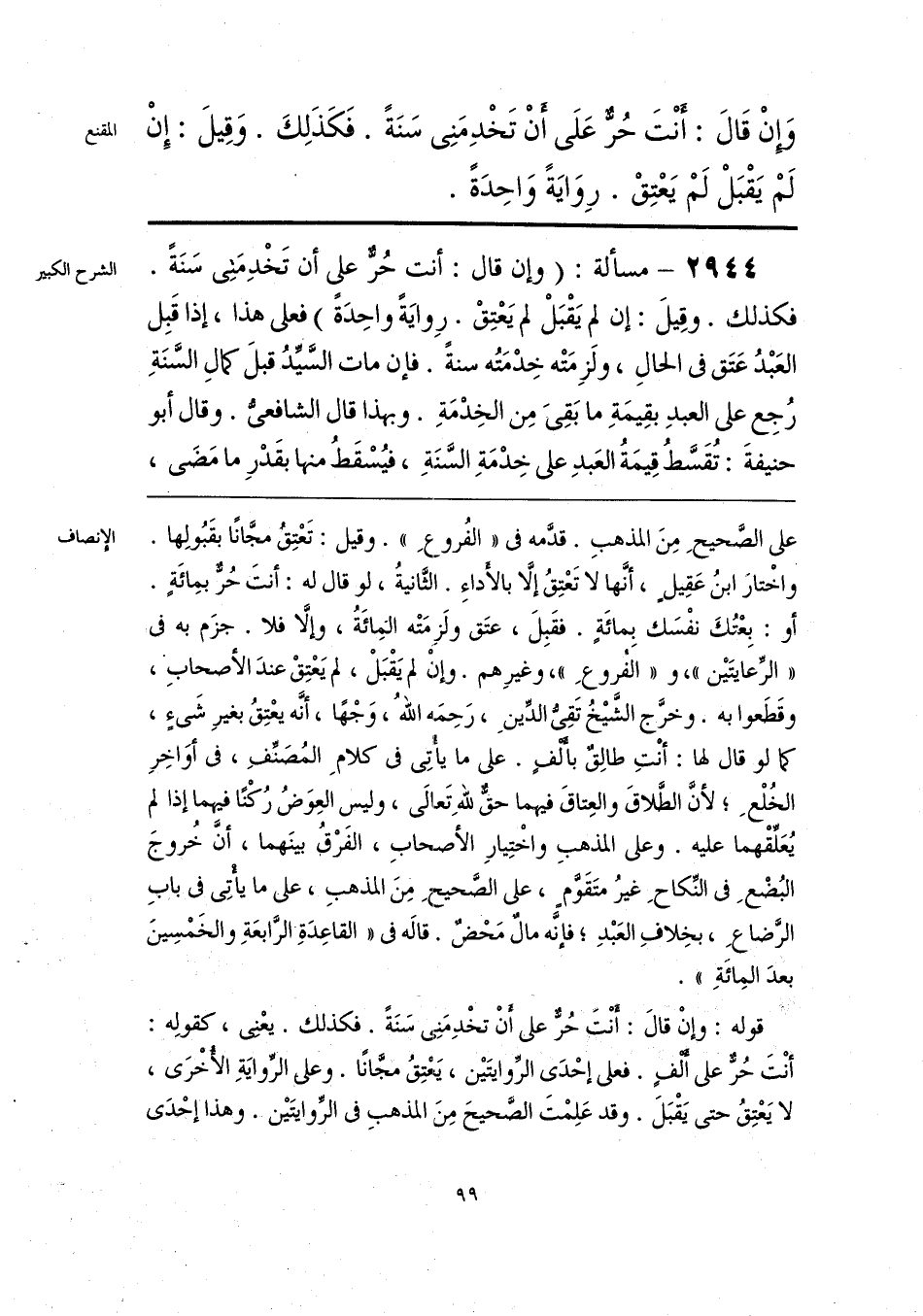 قوله: وإنْ قال: أَنْتَ حُرٌّ على أنْ تخْدِمَنِي سَنَةً. فكذلك. يعْني، كقولِه: أنْتَ حُرٌّ على أَلْفٍ. فعلى إحْدَى الرِّوايتَين، يَعْتِقُ مجَّانًا. وعلى الرِّوايَةِ الأُخْرَى، لا يَعْتِقُ حتى يَقْبَلَ. وقد عَلِمْتَ الصَّحيحَ مِنَ المذهبِ في الرِّوايتَين. وهذا إحْدَى