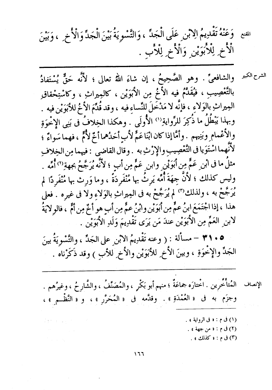 وَعَنْهُ تَقْدِيمُ الابْنِ عَلَى الْجَدِّ، وَالتَّسْويَةُ بَينَ الْجَدِّ وَالْأخِ، وَبَينَ الْأَخِ لِلْأبَوَينَ وَالْأخِ لِلْأَبِ.