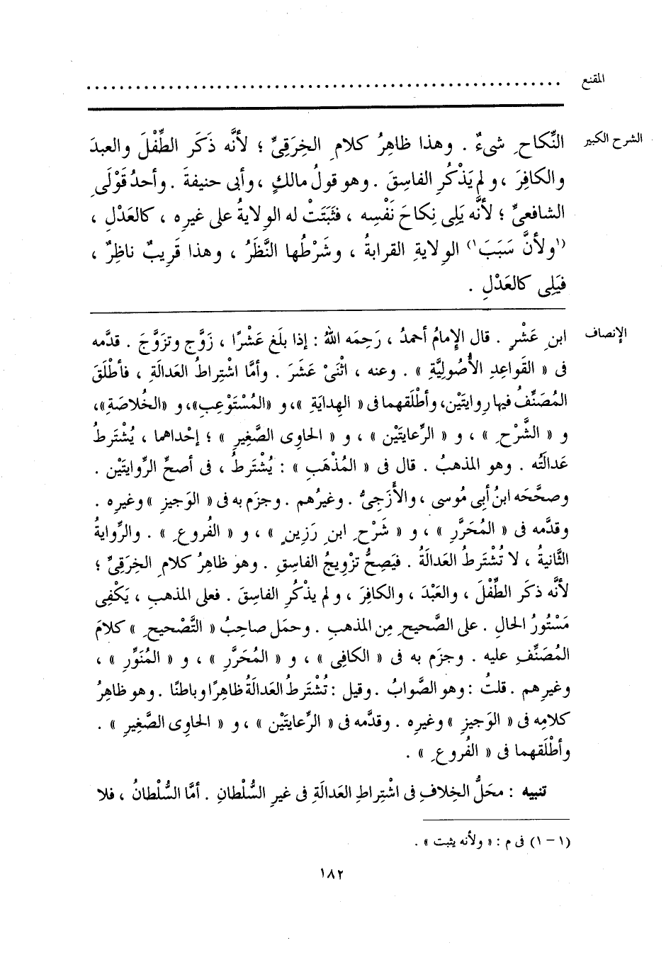 ابنِ عَشْرٍ. قال الإِمامُ أحمدُ، رَحِمَه اللهُ: إذا بلَغ عَشْرًا، زَوَّج وتزَوَّجَ. قدَّمه في «القَواعِدِ الأصُولِيَّةِ». وعنه، اثْنَى عَشَرَ. وأمَّا اشْتِراطُ العَدالةِ، فأطْلَقَ المُصَنِّفُ فيها رِوايتَين، وأطْلَقهما في «الهِدايَةِ»، و «المُسْتَوْعِبِ»، و «الخُلاصَةِ»، و «الشَّرْحِ»، و «الرِّعايتَين»، و «الحاوي الصَّغِيرِ»؛ إحْداهما، يُشْتَرطُ عَدالتُه. وهو المذهبُ. قال في «المُذْهَبِ»: يُشْتَرطُ، في أصحِّ الرِّوايتَين. وصحَّحَه ابنُ أبِي مُوسى، والأزَجِيُّ. وغيرُهم. وجزَم به في «الوَجيزِ» وغيرِه. وقدَّمه في «المُحَرَّرِ»، و «شَرْحِ ابنِ رَزِينٍ»، و «الفُروعِ». والرِّوايةُ الثَّانيةُ، لا تُشْتَرطُ العَدالةُ. فيَصِحُّ تزْويجُ الفاسِقِ. وهو ظاهِرُ كلامِ الخِرَقِيِّ؛ لأنَّه ذكَر الطِّفْلَ، والعَبْدَ، والكافِرَ، ولم يذْكُرِ الفاسِقَ. فعلى المذهبِ، يَكْفِي مَسْتُورُ الحالِ. على الصَّحيحِ مِن المذهبِ. وحمَل صاحِبُ «التَّصْحيحِ» كلامَ المُصَنِّفِ عليه. وجزَم به في «الكافِي»، و «المُحَرَّرِ»، و «المُنَوِّر»، وغيرِهم. قلتُ: وهو الصَّوابُ. وقيل: تُشْتَرطُ العَدالةُ ظاهِرًا وباطنًا. وهو ظاهِرُ كلامِه في «الوَجيزِ» وغيرِه. وقدَّمه في «الرِّعايتَين»، و «الحاوي الصَّغِيرِ». وأطْلَقهما في «الفُروعِ».