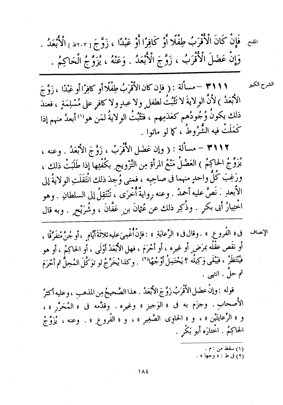 فَإِنْ كَانَ الْأقْرَبُ طِفْلًا أوْ كَافِرًا أوْعَبْدًا، زَوَّجَ الْأَبْعَدُ. وإنْ عَضَلَ الْأَقْرَبُ، زَوَّجَ الْأبْعَدُ. وَعَنْهُ، يُزَوجُ الْحَاكِمُ.