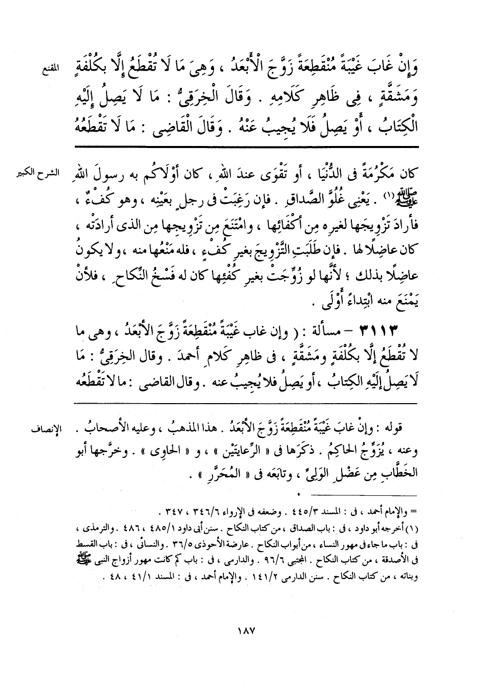 وَإنْ غَابَ غَيبَةً مُنْقَطِعَةً زَوَّجَ الْأَبْعَدُ، وَهِيَ مَا لَا تُقْطَعُ إلا بكُلْفَةٍ وَمَشَقَّةٍ، فِي ظَاهِرِ كَلَامِهِ. وَقَال الخرَقِيُّ: مَا لَا يَصِلُ إلَيهِ الْكِتَابُ، أوْ يَصِلُ فَلَا يُجِيبُ عَنْهُ. وَقَال الْقَاضِي: مَا لَا تَقْطَعُهُ