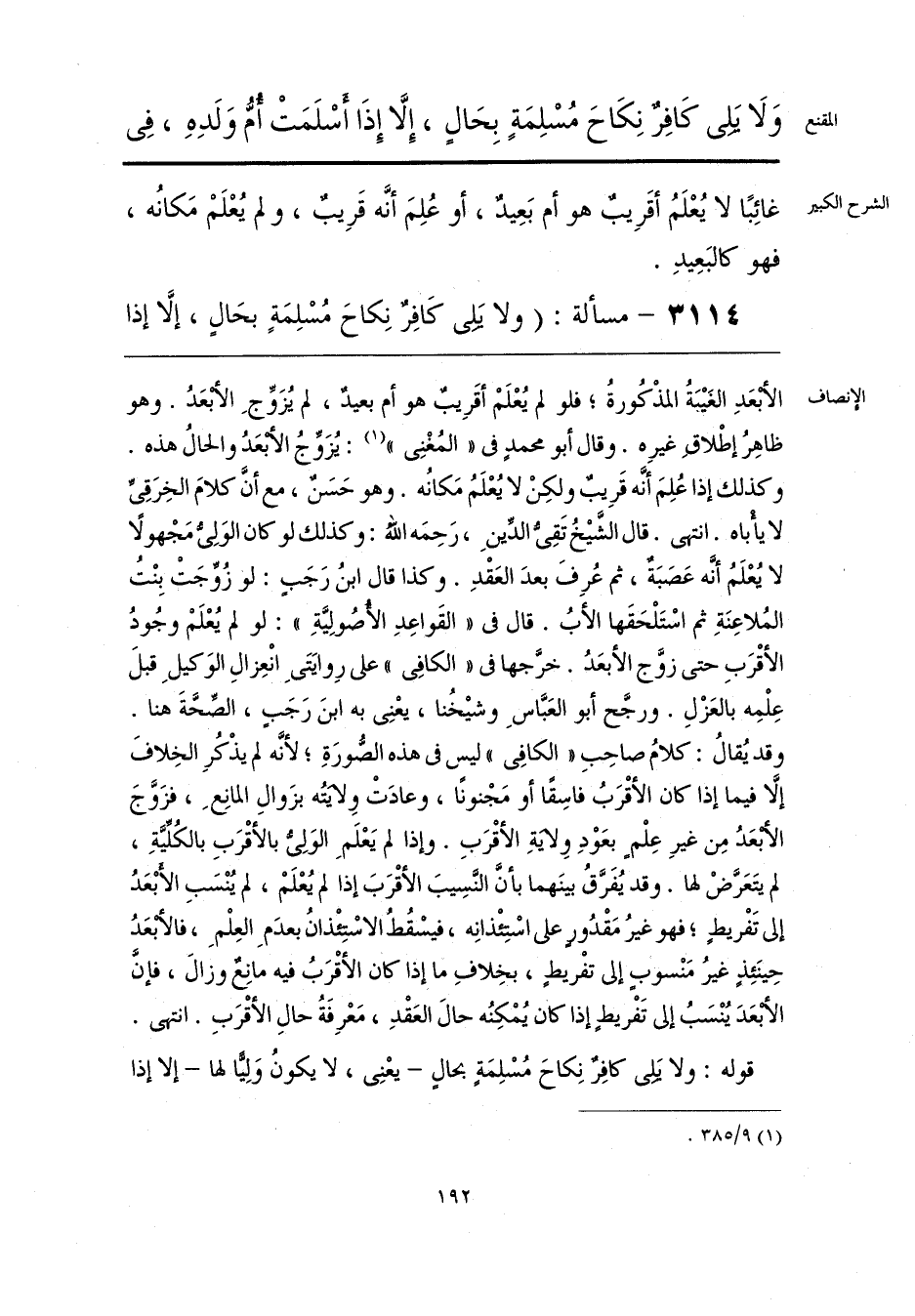 الأبْعَدِ الغَيبَةُ المذْكُورةُ؛ فلو لم يُعْلَمْ أقَرِيبٌ هو أم بعيدٌ، لم يُزَوِّجِ الأبْعَدُ. وهو ظاهِرُ إطْلاقِ غيرِه. وقال أبو محمدٍ في «المُغْنِي» (¬1): يُزَوِّجُ الأبعَدُ والحالُ هذه. وكذلك إذا عُلِمَ أنَّه قَرِيبٌ ولكِنْ لا يُعْلَمُ مَكانُه. وهو حَسَنٌ، مع أنَّ كلامَ الخِرَقِيِّ لا يأْباه. انتهى. قال الشَّيخُ تَقِيُّ الدِّينِ، رَحِمَه الله: وكذلك لو كان الوَلِيُّ مَجْهولًا لا يُعْلَمُ أنَّه عَصَبَةٌ، ثم عُرِفَ بعدَ العَقْدِ. وكذا قال ابنُ رَجَبٍ: لو زُوِّجَتْ بِنْتُ المُلاعِنَةِ ثم اسْتَلْحَقَها الأبُ. قال في «القَواعِدِ الأُصُولِيَّةِ»: لو لم يُعْلَمْ وجُودُ الأقْرَبِ حتى زوَّج الأبعَدُ. خرَّجها في «الكافِي» على رِوايَتَي انْعِزالِ الوَكيلِ قبلَ عِلْمِه بالعَزْلِ. ورجَّح أبو العَبَّاسِ وشيخُنا، يعْنِي به ابنَ رَجَبٍ، الصِّحَّةَ هنا. وقد يُقالُ: كلامُ صاحِبِ «الكافِي» ليس في هذه الصُّورَةِ؛ لأنَّه لم يذْكُرِ الخِلافَ إلَّا فيما إذا كان الأقْرَبُ فاسِقًا أو مَجْنونًا، وعادَتْ ولايَتُه بزَوالِ المانِعِ، فزَوَّجَ الأبعَدُ مِن غيرِ عِلْمٍ بعَوْدِ ولايَةِ الأقْرَبِ. وإذا لم يَعْلَمِ الوَلِيُّ بالأقْرَبِ بالكُلِّيَّةِ، لم يتَعَرَّضْ لها. وقد يُفَرَّقُ بينَهما بأنَّ النَّسِيبَ الأقْرَبَ إذا لم يُعْلَمْ، لم يُنْسَبِ الأبْعَدُ إلى تَفْريطٍ؛ فهو غيرُ مَقْدُورٍ على اسْتِئْذانِه، فيسْقُطُ الاسْتِئْذانُ بعدَمِ العِلْمِ، فالأبعَدُ حِينَئِذٍ غيرُ مَنْسوبٍ إلى تفْريطٍ، بخِلافِ ما إذا كان الأقْرَبُ فيه مانِعٌ وزال، فإنَّ الأبْعَدَ يُنْسَبُ إلى تَفْريطٍ إذا كان يُمْكِنُه حال العَقْدِ، مَعْرِفَةُ حالِ الأقرَبِ. انتهى.