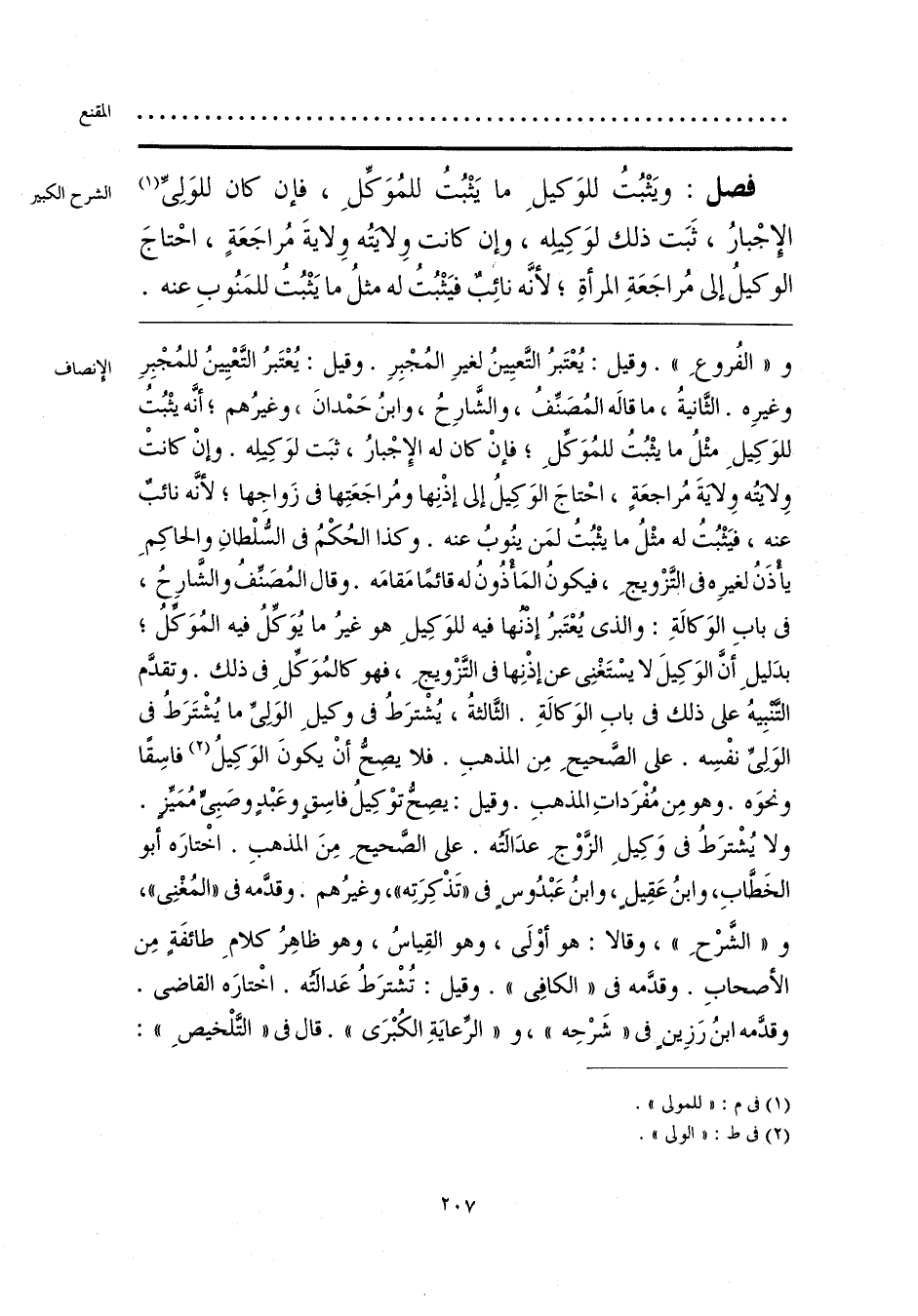 و «الفُروعِ». وقيل: يُعْتَبرُ التَّعيِينُ لغيرِ المُجْبِرِ. وقيل: يُعْتَبرُ التَّعْيِينُ للمُجْبِرِ وغيرِه. الثَّانيةُ، ما قاله المُصَنِّفُ، والشَّارِحُ، وابنُ حَمْدانَ، وغيرُهم، أنَّه يثْبُت للوَكِيلِ مثْلُ ما يثْبُتُ للمُوَكِّلِ؛ فإنْ كان له الإِجْبارُ، ثبَت لوَكِيلِه. وإنْ كانت ولايَتُه ولايةَ مُراجعَةٍ، احْتاجَ الوَكِيلُ إلى إذْنِها ومُراجَعَتِها في زَواجها، لأنَّه نائب عنه، فيَثْبُتُ له مثْلُ ما يثْبُتُ لمَن ينُوبُ عنه. وكذا الحُكْمُ في السُّلْطانِ والحاكِمِ يأْذَنُ لغيرِه في التَّزْويجِ، فيكونُ المَأْذُونُ له قائمًا مَقامَه. وقال المُصَنِّفُ والشَّارِحُ، في باب الوَكالةِ: والذي يُعْتَبرُ إذنها فيه للوَكِيلِ هو غيرُ ما يُوَكِّلُ فيه المُوَكِّلُ، بدَليلِ أَنَّ الوَكِيلَ لا يسْتَغْنِي عن إذْنِها في التَّزْويجِ، فهو كالمُوَكِّلِ في ذلك. وتقدّم التنبِيهُ على ذلك في بابِ الوَكالةِ. الثَّالثةُ، يُشْترَطُ في وكيلِ الوَلِيِّ ما يُشْتَرَطُ في الوَلِيِّ نفْسِه. على الصَّحيحِ مِن المذهبِ. فلا يصِحُّ أنْ يكونَ الوَكِيلُ (¬1) فاسِقًا ونحوَه. وهو مِن مُفْرَداتِ المذهبِ. وقيل: يصِحُّ توْكِيلُ فاسِقٌ وعَبْدٍ وصَبِي مُمَيِّزٍ. ولا يُشْترَطُ في وَكِيلِ الزَّوْجِ عدَالته. على الصَّحيحِ مِنَ المذهبِ. اخْتارَه أبو الخَطَّابِ، وابنُ عَقِيلٍ، وابنُ عَبْدُوس في «تَذْكِرَتِه»، وغيرُهم. وقدَّمه في «المُغْنِي»، و «الشَّرْحِ»، وقالا: هو أوْلَى، وهو القِياسُ، وهو ظاهِرُ كلامِ طائفَةٍ مِن الأصحابِ. وقدَّمه في «الكافِي». وقيل: تُشْترَطُ عَدالتُه. اخْتارَه القاضي. وقدَّمه ابنُ رَزِينٍ في «شَرْحِه»، و «الرِّعايَةِ الكُبْرَى». قال في «التَّلْخيصِ»: