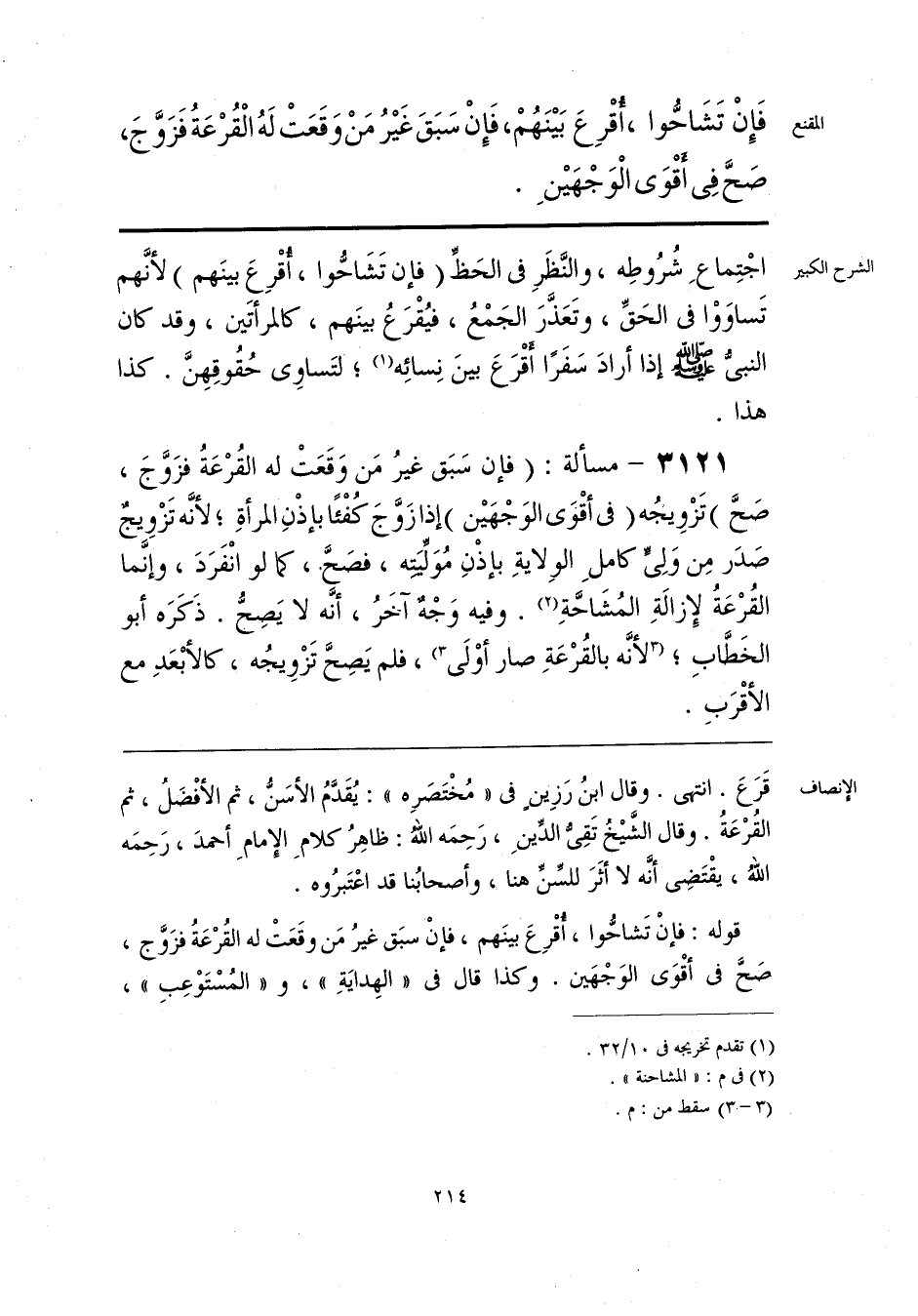 قَرَعَ. انتهى. وقال ابنُ رَزِينٍ في «مُخْتَصَرِه»: يُقَدَّمُ الأسَنُّ، ثم الأفْضَلُ، ثم القُرْعَةُ. وقال الشَّيخُ تَقِيُّ الدِّينِ، رَحِمَه اللهُ: ظاهِرُ كلامِ الإمامِ أحمدَ، رَحِمَه اللهُ، يقْتَضِي أنَّه لا أثَرَ للسِّن هنا، وأصحابُنا قد اعْتَبرُوه.