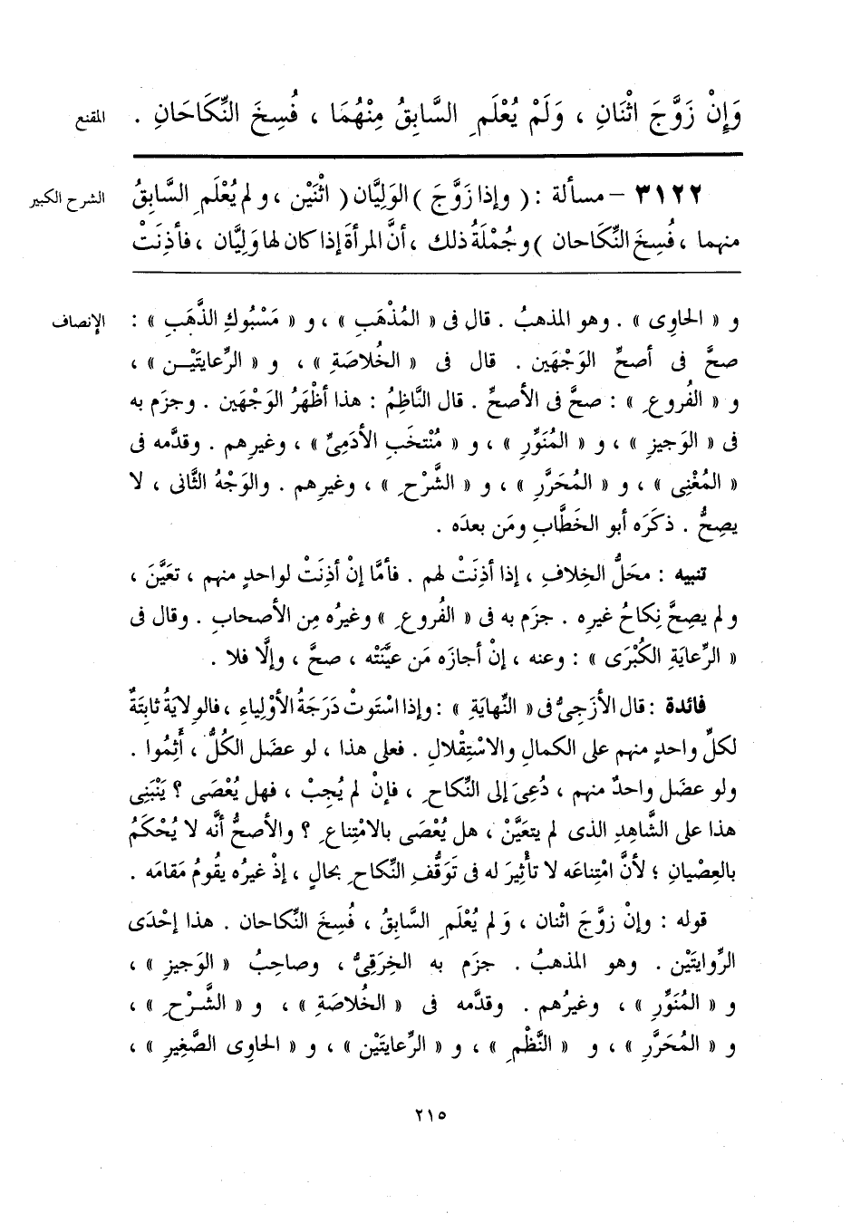 قوله: وإنْ زوَّجَ اثْنان، وَلم يُعْلَمِ السَّابِق، فُسِخَ النَّكاحان. هذا إحْدَى الرِّوايتَين. وهو المذهبُ. جزَم به الخِرَقِيُّ، وصاحِبُ «الوَجيزِ»، و «المُنَوِّرِ»، وغيرُهم. وقدَّمه في «الخُلاصَةِ»، و «الشَّرْحِ»، و «المُحَرَّرِ»، و «النَّظْمِ»، و «الرِّعايتَين»، و «الحاوي الصّغِيرِ»،