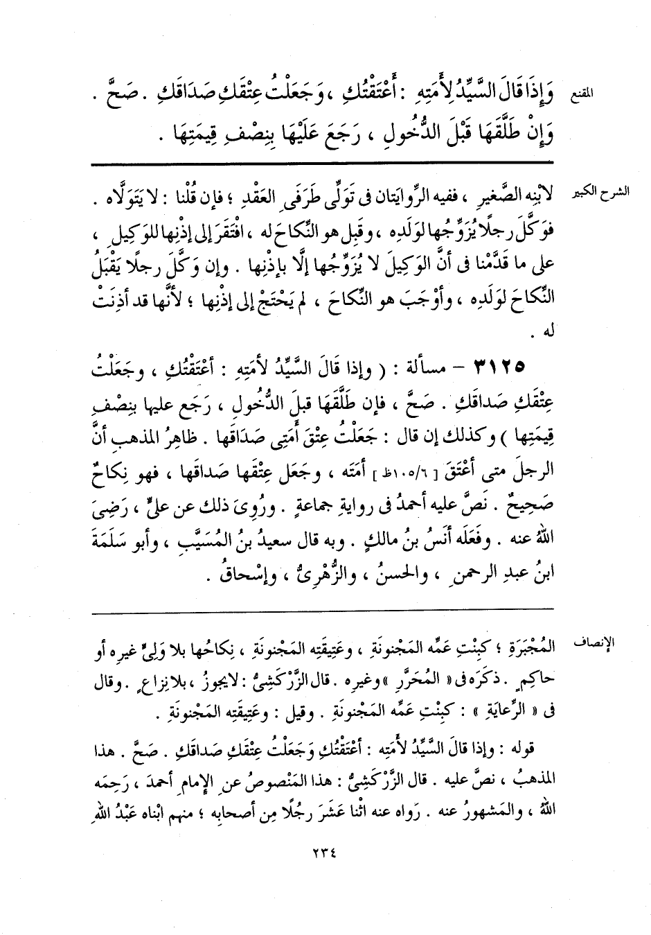 قوله: وإذا قال السَّيِّدُ لأمَتِه: أعْتَقْتُكِ وَجَعَلْتُ عِتْقَكِ صَداقَكِ. صَحَّ. هذا المذهبُ، نصَّ عليه. قال الزَّرْكَشِيُّ: هذا المَنْصوصُ عنِ الإِمامِ أحمدَ، رَحِمَه اللهُ، والمَشهورُ عنه. رَواه عنه اثْنا عَشَرَ رجُلًا مِن أصحابِه؛ منهم ابْناه عَبْدُ اللهِ