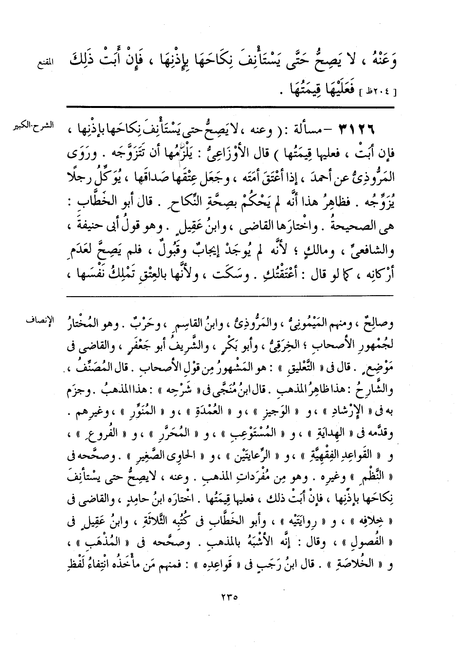 وصالِحٌ، ومنهم المَيمُونِيُّ، والمَرُّوذِيُّ، وابنُ القاسِمِ، وحَرْبٌ. وهو المُخْتارُ لجُمْهورِ الأصحابِ؛ الخِرَقِيُّ، وأبو بَكْرٍ، والشَّرِيفُ أبو جَعْفَرٍ، والقاضي في مَوْضِع. قال في «التَّعْليقِ»: هو المَشْهورُ مِن قوْلِ الأصحابِ. قال المُصَنِّفُ. والشَّارِحُ: هذا ظاهِرُ المذهبِ. قال ابنُ مُنَجَّى في «شَرْحِه»: هذا المذهبُ. وجزَم به في «الإِرْشادِ»، و «الوَجيزِ»، و «العُمْدَةِ»، و «المُنَوَّرِ»، وغيرِهم. وقدَّمه في «الهِدايَةِ»، و «المُسْتَوْعِبِ»، و «المُحَرَّرِ»، و «الفُروعِ»، و «القَواعِدِ الفِقْهِيَّةِ»، و «الرِّعايتَين»، و «الحاوي الصَّغِيرِ». وصحَّحه في «النظْمِ» وغيرِه. وهو مِن مُفْرَداتِ المذهبِ. وعنه، لا يصِحُّ حتَّى يسْتأنِفَ نِكاحَها بإذنِها، فإنْ أَبَتْ ذلك، فعليها قِيمَتُها. اخْتارَه ابنُ حامِدٍ، والقاضي في «خِلافِه»، و «رِوايَتَيه»، وأبو الخَطَّابِ في كُتُبِه الثَّلَاثَةِ، وابنُ عَقِيلٍ في «الفُصولِ»، وقال: إنَّه الأشْبَهُ بالمذهبِ. وصحَّحه في «المُذْهَبِ»، و «الخُلاصَةِ». قال ابنُ رَجَب في «قَواعِدِه»: فمنهم مَن مأْخَذُه انْتِفاءُ لَفْظِ