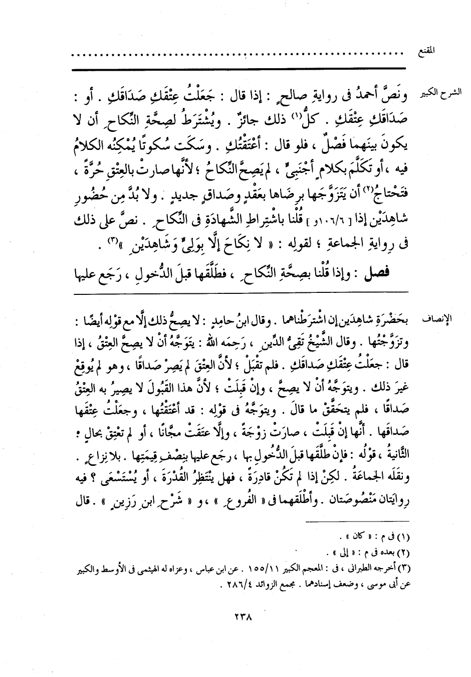 بحَضْرَةِ شاهِدَين إن اشْترَطْناهما. وقال ابنُ حامِدٍ: لا يصِحُّ ذلك إلَّا مع قوْلِه أيضًا: وتزَوَّجْتُها. وقال الشَّيخُ تَقِيُّ الدِّينِ، رَحِمَه الله: يتَوَجّهُ أنْ لا يصِحُّ العِتْقُ، إذا قال: جعَلْتُ عِتْقَكِ صَداقَكِ. فلم تقْبَلْ، لأن العِتْقَ لم يَصِرْ صَداقًا، وهو لم يُوقِعْ غيرَ ذلك. ويتوَجَّهُ أنْ لا يصِحّ، وإنْ قَبِلَتْ، لأنَّ هذا القَبُولَ لا يصِيرُ به العِتْقُ صَداقًا، فلم يتحَققْ ما قال. ويتوَجَّهُ في قوْلِه: قد أعْتَقْتُها، وجعَلْتُ عِتْقَها صَداقَها. أنَّها إنْ قَبِلَتْ، صارَتْ زوْجَة، وإلَّا عتَقَتْ مجَّانًا، أو لم تعْتِقْ بحالٍ؛ الثَّانيةُ، قوْلُه: فإنْ طلَّقَها قبلَ الدُّخُولِ بها، رجَع عليها بنِصْفِ قِيمَتِها. بلا نِزاعٍ. ونقَلَه الجماعَةُ. لكِنْ إذا لم تَكُنْ قادِرَةً، فهل ينْتَظِرُ القُدْرَةَ، أو يُسْتَسْعَى؛ فيه رِوايَتان مَنْصُوصَتان. وأطْلَقهما في «الفُروعِ»، و «شَرْحِ ابنِ رَزِينٍ». قال