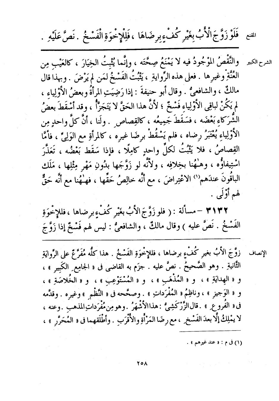 زوَّجَ الأبُ بغيرِ كُفْءٍ برضاها، فللإخْوَةِ الفَسْخُ. هذا كلُّه مُفَرَّعٌ على الرِّوايَةِ الثَّانيةِ. وهو الصَّحيحُ. نصَّ عليه. جزَم به القاضي في «الجامِعِ الكَبِيرِ»، و «الهِدايَةِ»، و «المُذْهَبِ»، و «المُسْتَوْعِبِ»، و «الخُلاصَةِ»، و «الوَجيزِ»، وناظِمُ «المُفْرَداتِ». وصحَّحه في «النَّظْمِ» وغيرِه. وقدَّمه في «الفُروعِ». قال الزَّرْكَشِيُّ: هذا الأشْهَرُ. وهو مِن مُفْرَداتِ المذهبِ. وعنه، لا يمْلِكُ إلَّا بعدَ الفَسْخِ، مع رِضَا المَرْأةِ والأقْرَبِ. وأطلَقهما في «المُحَرَّرِ»،
