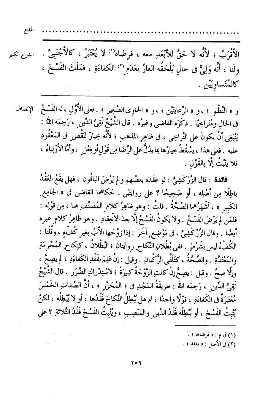 فائدة: قال الزَّرْكَشِي: لو عقَدَه بعضُهم ولم يَرْضَ الباقُون، فهل يقَعُ العَقْدُ باطِلًا مِن أصْلِه، أو صَحِيحًا؟ على رِوايتَين. حَكاهما القاضي في «الجامِعِ الكَبِيرِ»، أشْهَرُهما الصِّحَّةُ. قلتُ: وهو ظاهِرُ كلامِ المُصَنِّفِ هنا، مِن قوْلِه: فلمَن لم يَرْضَ الفَسْخُ. ولا يكونُ الفَسْخُ إلَّا بعدَ الانْعِقادِ. وهو ظاهِرُ كلامِ غيرِه أيضًا. وقال الزرْكَشِيُّ، في مَوْضِع آخَرَ: إذا زوَّجَها الأبُ بغيرِ كُفْءٍ، وقُلْنا: الكُفْءُ ليس بشَرْطٍ. ففي بُطْلانِ النِّكاحِ رِوايَتان؛ البُطْلانُ، كنِكاحِ المُحْرِمَةِ والمُعْتَدَّةِ. والصِّحَّةُ، كتَلَقِّي الرُّكْبانِ. وقيل: إنْ عَلِمَ بفَقْدِ الكَفاءَةِ، لم يصِحَّ، وإلَّا صحَّ. وقيل: يصِحُّ إنْ كانتِ الزَّوْجَةُ كبيرَةً؛ لاسْتِدْراكِ الضَّرَرِ. قال الشَّيخ تَقِيُّ الدِّينِ، رَحِمَه اللهُ: طريقَةُ المَجْدِ في «المُحَرَّرِ»، أنَّ الصِّفاتِ الخَمْسَ مُعْتَبَرَةٌ في الكَفاءَةِ، قوْلًا واحدًا، ثم هل يُبْطِلُ النِّكاحَ فَقْدُها، أو لا يُبْطِلُه، لكنْ يُثْبِتُ الفَسْخَ، أو يُبْطِلُه فَقْدُ الدِّينِ والمَنْصِبِ، ويُثْبِتُ الفَسْخَ فَقْدُ الثَّلاثةِ؟ على