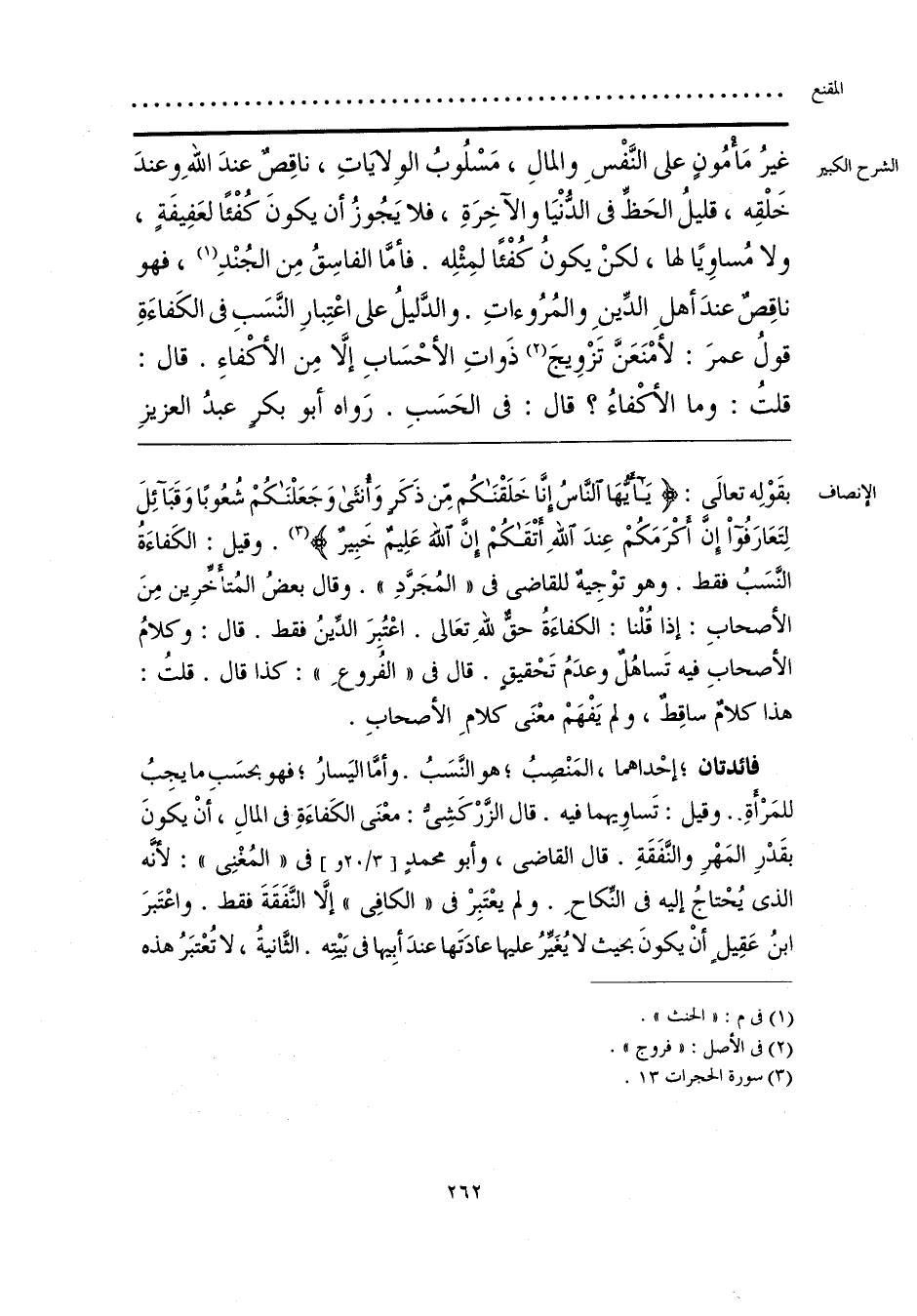 بقَوْلِه تعالى: {يَا أَيُّهَا النَّاسُ إِنَّا خَلَقْنَاكُمْ مِنْ ذَكَرٍ وَأُنْثَى وَجَعَلْنَاكُمْ شُعُوبًا وَقَبَائِلَ لِتَعَارَفُوا إِنَّ أَكْرَمَكُمْ عِنْدَ اللَّهِ أَتْقَاكُمْ إِنَّ اللَّهَ عَلِيمٌ خَبِيرٌ} (¬1). وقيل: الكَفاءَةُ النَّسَبُ فقط. وهو توْجِيهٌ للقاضي في «المُجَرَّدِ». وقال بعضُ المُتأَخِّرِين مِنَ الأصحابِ: إذا قُلْنا: الكفاءَةُ حق للهِ تعَالى. اعْتُبِرَ الدِّينُ فقط. قال: وكلامُ الأصحابِ فيه تَساهُلٌ وعدَمُ تَحْقيقٍ. قال في «الفُروعِ»: كذا قال. قلتُ: هذا كلامٌ ساقِطٌ، ولم يَفْهَمْ معْنَى كلامِ الأصحابِ.