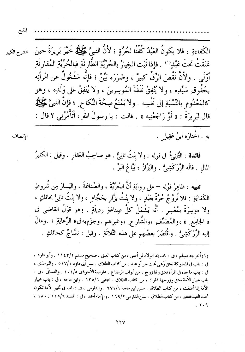 تنبيه: ظاهِرُ قوْلِه -على رِوايَةِ أنَّ الحُريَّةَ، والصِّناعَةَ، واليَسارَ مِن شُروطِ الكَفاءَةِ: فلا تُزوَّجُ حُرَّةٌ بعَبْدٍ، ولا بنْتُ بزَّازٍ بحَجَّامٍ، ولا بِنْتُ تانِئٍ بحائكٍ، ولا موسِرَةٌ بمُعْسِرٍ. أنَّه يَشْمَلُ كلَّ صِناعَةٍ ردِيئَةٍ. وهو قوْلُ القاضي في «الجامِعِ»، والمُصَنِّف، والشَّارِحِ، وغيرِهم. وجزَم به في «الرِّعايَةِ». ومال إليه الزَّرْكَشِيُّ. واقْتَصَرَ بعضُهم على هذه الثَّلاثَةِ. وقيل: نسَّاجٌ كحائكٍ.