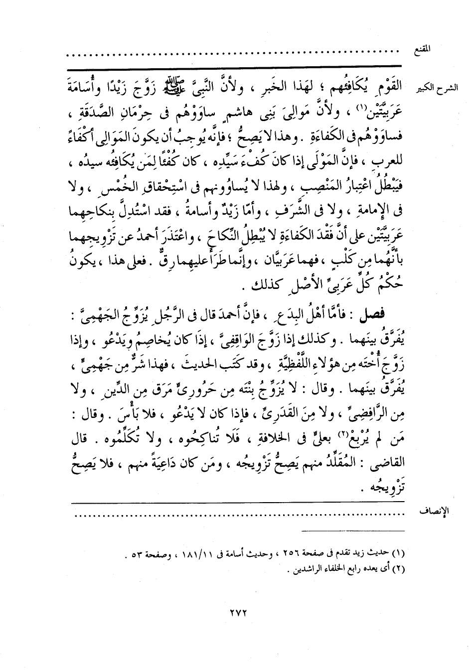 القَوْمِ يُكَافِئُهم؛ لهَذا الخَبرِ، ولأنَّ النَّبِيَّ - صلى الله عليه وسلم - زَوَّجَ زَيدًا وأُسَامَةَ عَرَبِيَّتَين (¬1)، ولأنَّ مَوالِيَ بَنِي هاشمٍ ساوَوْهُم في حِرْمَانِ الصَّدَقَةِ، فساوَوْهُم في الكَفاءَةِ. وهذا لا يَصِحُّ؛ فإنَّه يُوجِبُ أن يكونَ المَوَالِي أكْفَاءً للعربِ، فإنَّ المَوْلَى إذا كانَ كُفْءَ سَيِّدِه، كان كُفْئًا لِمَن يُكَافِئُه سيدُه، فيَبْطُلُ اعْتِبارُ المَنْصِبِ، ولهذا لا يُساوُونهم في اسْتِحْقاقِ الخُمْسِ، ولا في الإِمامةِ، ولا في الشَّرَفِ، وأمّا زَيدٌ وأسامةُ، فقد اسْتُدِلَّ بِنكاحِهِما عَرَبِيَّتين على أنَّ فَقْدَ الكَفاءَةِ لا يُبْطِلُ النِّكاحَ، واعْتَذَرَ أحمدُ عن تَزْويجهما بأنَّهُما مِن كَلْبٍ، فهما عَرَبيَّان، وإنَّما طَرَأَ عليهِما رِقٌّ. فعلى هذا، يكَونُ حُكْمُ كُلِّ عَرَبِيِّ الأصْلِ كذلك.