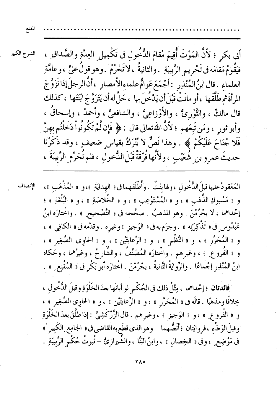 المَعْقودُ عليها قبلَ الدُّخُولِ، ولها بِنْتٌ. وأَطْلَقهما في «الهِدايَةِ»، و «المُذْهَبِ»، و «مَسْبوكِ الذَّهَبِ»، و «المُسْتَوْعِبِ»، و «الخُلاصَةِ»، و «البُلْغَةِ»؛ إحْداهما، لا يحْرُمْنَ. وهو المذهبُ. صحَّحه في «التَّصْحيحِ». واخْتارَه ابنُ عَبْدُوس في «تَذْكِرَتِه». وجزَم به في «الوَجيزِ» وغيرِه. وقدَّمه في «الكافِي»، و «المُحَرَّرِ»، و «النَّظْمِ»، و «الرِّعايتَين»، و «الحاوي الصَّغِيرِ»، و «الفُروعِ»، وغيرِهم. واخْتارَه المُصَنِّفُ، والشَّارِحُ، وغيرُهما، وحَكاه ابنُ المُنْذِرِ إجْماعًا. والرِّوايَةُ الثَّانيةُ، يحْرُمْنَ. اخْتارَه أبو بَكْرٍ في «المُقْنِعِ».