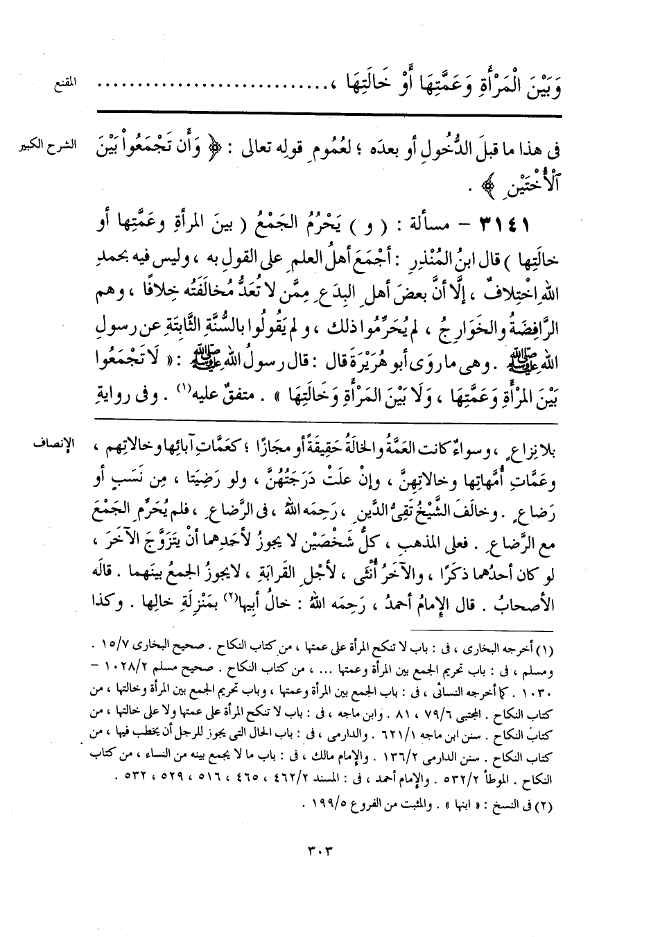 بلا نِزاعٍ، وسواءٌ كانت العَمَّةُ والخالةُ حَقِيقَةً أو مجَازًا، كعَمَّاتِ آبائِها وخالاتِهم، وعَمَّاتِ أُمَّهاتِها وخالاتِهِنَّ، وإنْ علَتْ دَرَجَتُهُنَّ، ولو رَضِيَتا، مِن نَسَبٍ أو رَضاعٍ. وخالفَ الشَّيخُ تَقِيُّ الدَّينِ، رَحِمَه الله، في الرَّضاعِ، فلم يُحَرمِ الجَمْعَ مع الرَّضاعِ. فعلى المذهبِ، كلُّ شَخْصَين لا يجوزُ لأحَدِهما أنْ يتَزَوَّجَ الآخَرَ، لو كان أحدُهما ذكَرًا، والآخَرُ أُنثَى، لأجْلِ القَرابَةِ، لا يجوزُ الجمعُ بينَهما. قاله الأصحابُ. قال الإِمامُ أحمدُ، رَحِمَه اللهُ: خالُ أبِيها (¬1) بمَنْزِلَةِ خالِها. وكذا