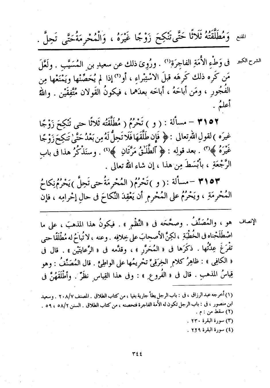 وَمُطَلَّقَتُهُ ثَلَاثًا حَتَّى تَنْكِحَ زَوْجًا غَيرَهُ، وَالْمُحْرِمَةُ حَتَّى تَحِلَّ.