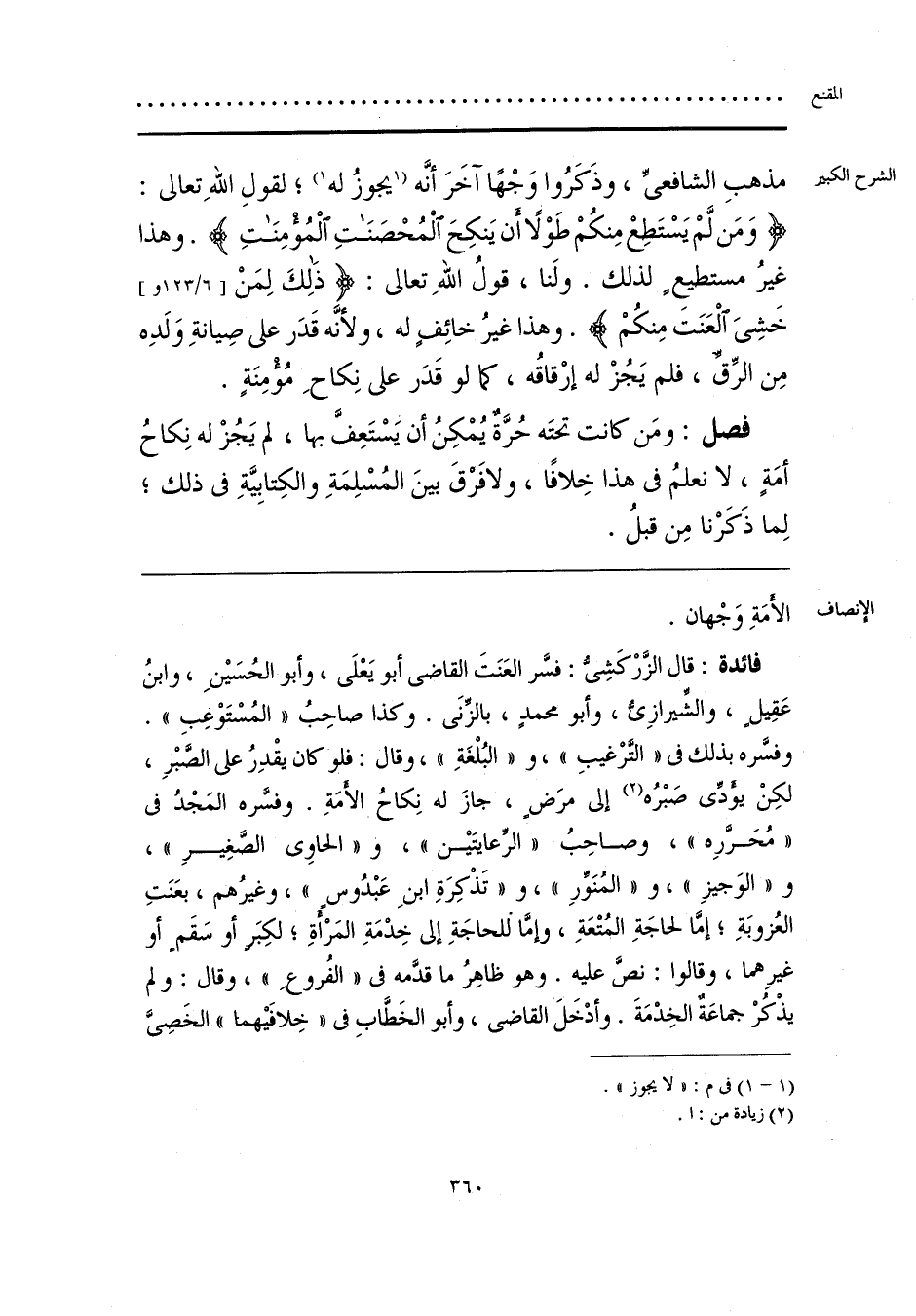 فائدة: قال الزَّرْكَشِيُّ: فسَّر العَنَتَ القاضي أبو يَعْلَى، وأبو الحُسَينِ، وابنُ عَقِيلٍ، والشِّيرازِيُّ، وأبو محمدٍ، بالزِّنَى. وكذا صاحِبُ «المُسْتَوْعِبِ». وفسَّره بذلك في «التَّرْغيبِ»، و «البُلْغَةِ»، وقال: فلو كان يقْدِرُ على الصَّبْرِ، لكِنْ يؤَدِّي صَبْرُه (¬1) إلى مرَضٍ، جازَ له نِكاحُ الأَمَةِ. وفسَّره المَجْدُ في «مُحَرَّرِه»، وصاحِبُ «الرِّعايتَين»، و «الحاوي الصَّغِيرِ»، و «الوَجيزِ»، و «المُنَوِّرِ»، و «تَذْكِرَةِ ابنِ عَبْدُوسٍ»، وغيرُهم، بعَنَتِ العُزوبَةِ؛ إمَّا لحاجَةِ المُتْعَةِ، وإمَّا للحاجَةِ إلى خِدْمَةِ المَرْأةِ، لكِبَرٍ أو سَقَمٍ أو غيرِهما، وقالوا: نصَّ عليه. وهو ظاهِرُ ما قدَّمه في «الفُروعِ»، وقال: ولم يذْكُرْ جماعَةٌ الخِدْمَةَ. وأدْخَلَ القاضي، وأبو الخَطَّابِ في «خِلافَيهما» الخَصِيَّ