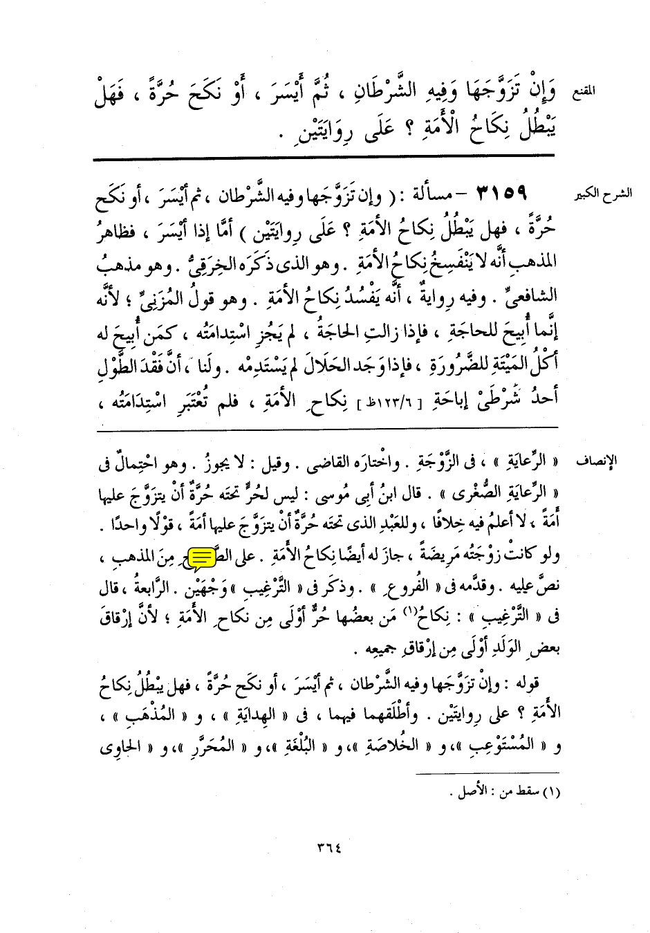 «الرِّعايَةِ»، في الزَّوْجَةِ. واخْتارَه القاضي. وقيل: لا يجوزُ. وهو احْتِمالٌ في «الرِّعايَةِ الصُّغْرى». قال ابنُ أبِي مُوسى: ليس لحُرٍّ تحتَه حُرَّةٌ أنْ يتزَوَّجَ عليها أَمَةً، لا أعلمُ فيه خِلافًا، وللعَبْدِ الذي تحتَه حُرَّةٌ أنْ يتزَوَّجَ عليها أمَةً، قولًا واحدًا. ولو كانتْ زوْجَتُه مَرِيضَةً، جازَ له أيضًا نِكاحُ الأَمَةِ. على الصَّحيحِ مِنَ المذهبِ، نصَّ عليه. وقدَّمه في «الفُروعِ». وذكَر في «التَّرْغِيبِ» وَجْهَين. الرَّابعةُ، قال في «التَّرْغِيبِ»: نِكاحُ (¬1) مَن بعضُها حُرٌّ أوْلَى مِن نكاحِ الأَمَةِ؛ لأنَّ إرْقاقَ بعضِ الوَلَدِ أوْلَى مِن إرْقاقِ جميعِه.