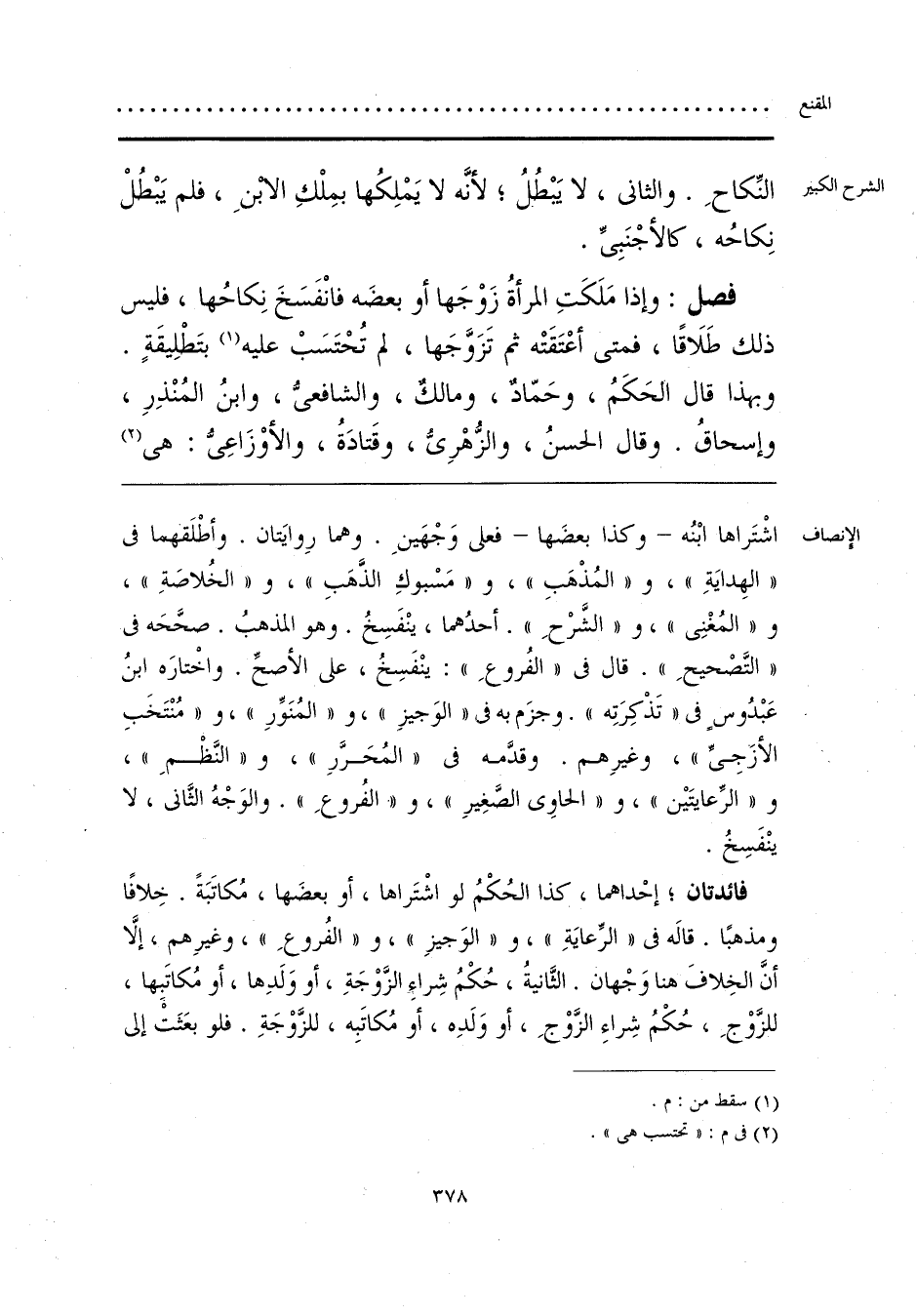 اشْتَراها ابْنُه -وكذا بعضَها- فعلى وَجْهَينِ. وهما رِوايَتان. وأطْلَقهما في «الهِدايَةِ»، و «المُذْهَبِ»، و «مَسْبوكِ الذَّهَبِ»، و «الخُلاصَةِ»، و «المُغْنِي»، و «الشَّرْحِ». أحدُهما، ينْفَسِخُ. وهو المذهبُ. صحَّحَه في «التَّصْحيحِ». قال في «الفُروعِ»: ينْفَسِخُ، على الأصحِّ. واخْتارَه ابنُ عَبْدُوس في «تَذْكِرَتِه». وجزَم به في «الوَجيزِ»، و «المُنَوِّرِ»، و «مُنْتَخَبِ الأزَجِيِّ»، وغيرِهم. وقدَّمه في «المُحَرَّرِ»، و «النَّظْمِ»، و «الرِّعايتَين»، و «الحاوي الصغِيرِ»، و «الفُروعِ». والوَجْهُ الثَّاني، لا ينْفَسِخُ.