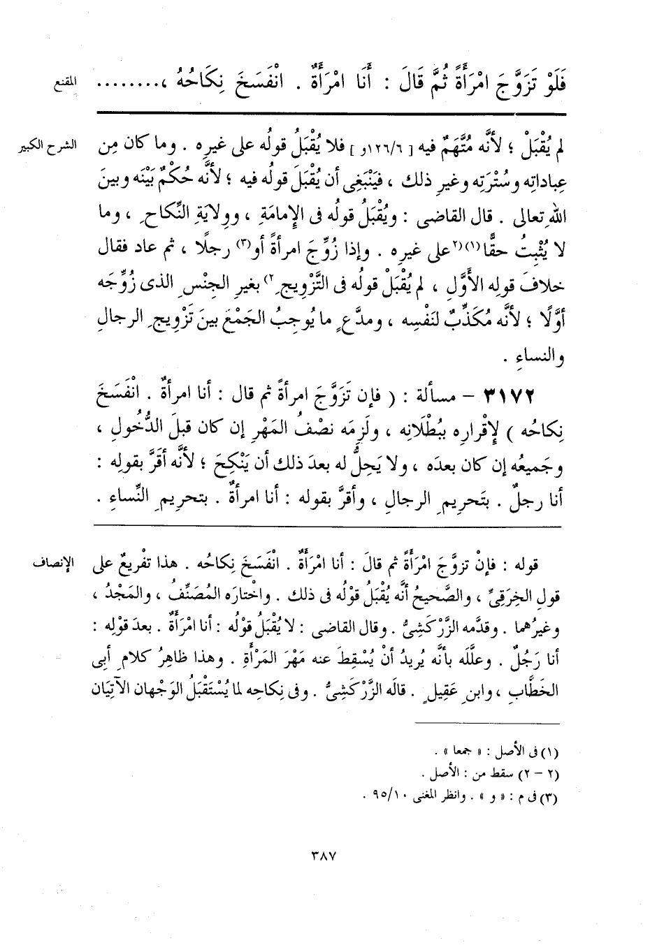 قوله: فإنْ تزوَّجَ امْرَأةً ثم قال: أنا امْرَأةٌ. انْفَسَخَ نِكاحُه. هذا تفْريعٌ على قولِ الخِرَقِيِّ، والصَّحيحُ أنَّه يُقْبَلُ قوْلُه في ذلك. واخْتارَه المُصَنِّفُ، والمَجْدُ، وغيرُهما. وقدَّمه الزَّرْكَشِيُّ. وقال القاضي: لا يُقْبَلُ قوْلُه: أنا امْرَأةٌ. بعدَ قوْلِه: أنا رَجُلٌ. وعلَّلَه بأنَّه يُريدُ أنْ يُسْقِطَ عنه مَهْرَ المَرْأةِ. وهذا ظاهِرُ كلام أبِي الخَطَّابِ، وابنِ عَقِيلٍ. قاله الزَّرْكَشِيُّ. وفي نِكاحِه لما يُسْتَقْبَلُ الوَجْهان الآتِيَان