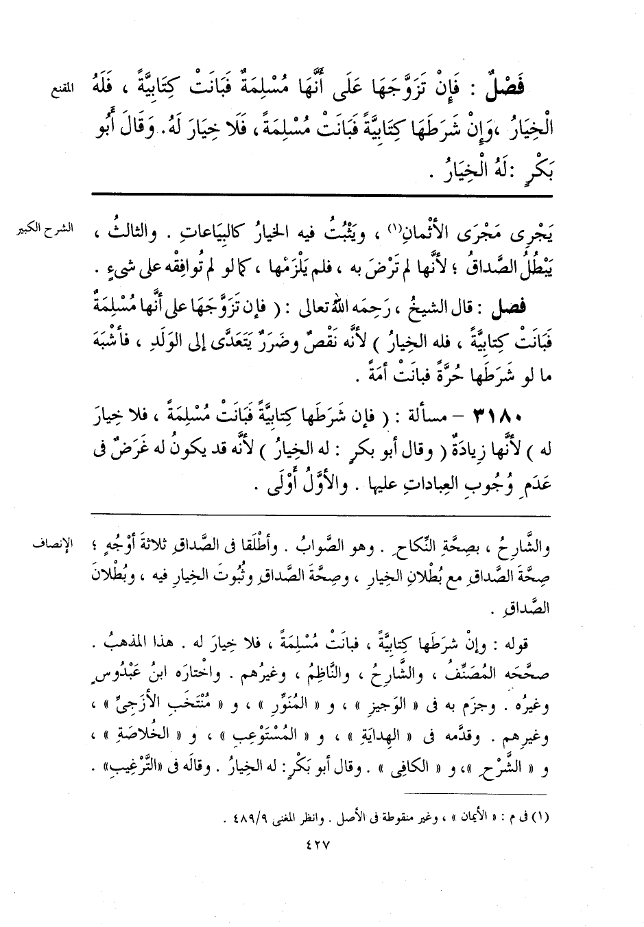 قوله: وإنْ شرَطَها كِتابِيَّةً، فبانَتْ مُسْلِمَةً، فلا خِيارَ له. هذا المذهبُ. صحَّحَه المُصَنِّفُ، والشَّارِحُ، والنَّاظِمُ، وغيرُهم. واخْتارَه ابنُ عَبْدُوس وغيرُه. وجزَم به في «الوَجيزِ»، و «المُنَوِّرِ»، و «مُنْتَخَبِ الأزَجِيِّ»، وغيرِهم. وقدَّمه في «الهِدايَةِ»، و «المُسْتَوْعِبِ»، و «الخُلاصَةِ»، و «الشَّرْحِ»، و «الكافِي». وقال أبو بَكْرٍ: له الخِيارُ. وقاله في «التَّرْغِيبِ».