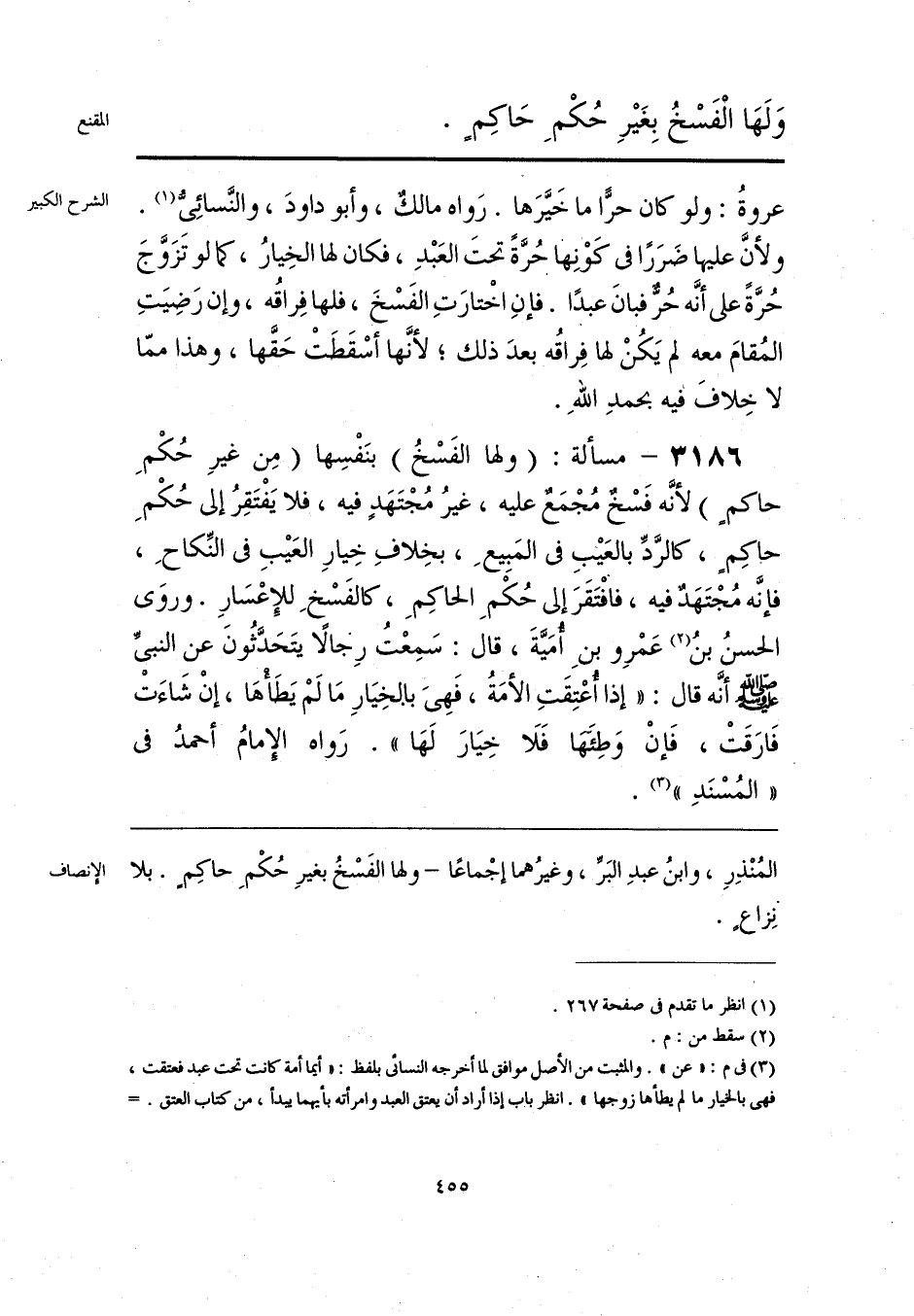 المُنْذِرِ، وابنُ عبدِ البَرِّ، وغيرُهما إجْماعًا- ولها الفَسْخُ بغيرِ حُكْمِ حاكِمٍ. بلا نِزاعٍ.
