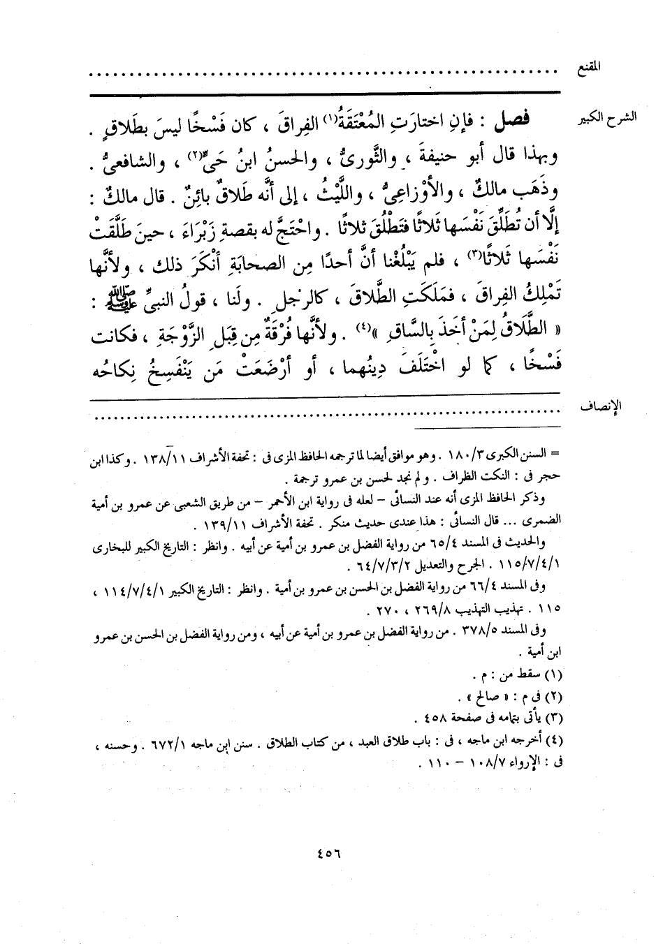 فصل: فإنِ اختارَتِ المُعْتَقَةُ (¬1) الفِراقَ، كان فَسْخًا ليس بطَلاقٍ. وبهذا قال أبو حنيفةَ، والثَّوريُّ، والحسنُ بنُ حَيٍّ (¬2)، والشافعيُّ. وذَهَب مالكٌ والأوْزاعِيُّ، واللَّيثُ، إلى أنَّه طَلاقٌ بائِنٌ. قال مالكٌ: إلَّا أن تُطَلِّقَ نَفْسَها ثَلاثًا فتَطْلُقَ ثلاثًا. واحْتَجَّ له بقصةِ زَبْرَاءَ، حينَ طَلَّقَتْ نَفْسَها ثَلاثًا (¬3)، فلم يَبْلُغْنا أنَّ أحدًا مِن الصحابَةِ أَنْكَرَ ذلك، ولأنَّها تَمْلِكُ الفِراقَ، فمَلَكَتِ الطَّلاقَ، كالرجلِ. ولَنا، قولُ النبيِّ - صلى الله عليه وسلم -: «الطَّلَاقُ لِمَنْ أخَذَ بِالسَّاقِ» (¬4). ولأنَّها فُرْقَةٌ مِن قِبَلِ الزَّوْجَةِ، فكانت فَسْخًا، كما لو اخْتَلَف دِينُهما، أو أرْضَعَتْ مَن يَنْفَسِخُ نِكاحُه