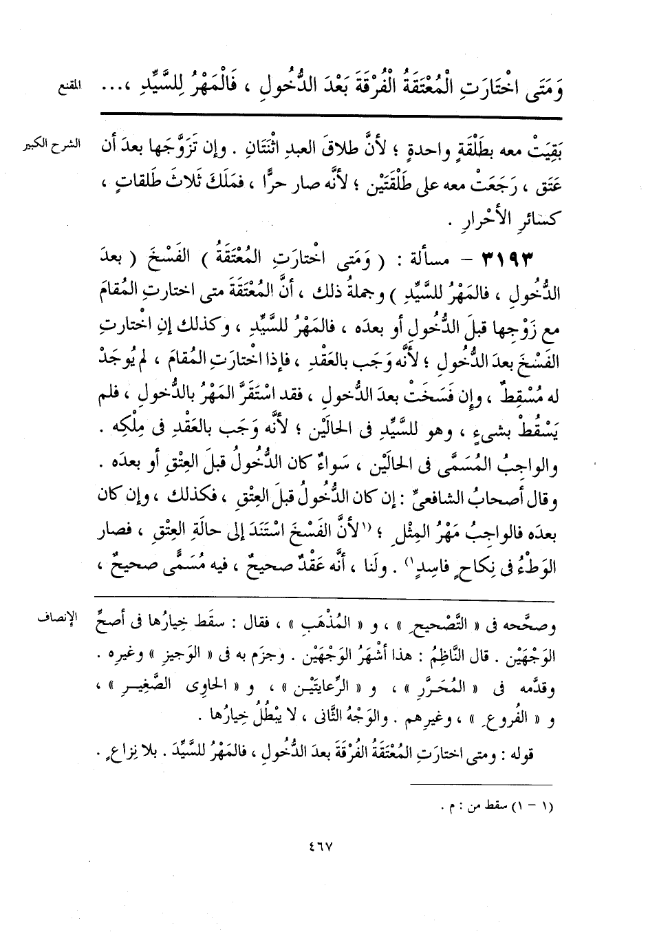 قوله: ومتى اختارَتِ المُعْتَقَةُ الفُرْقَةَ بعدَ الدُّخُولِ، فالمَهْرُ للسَّيِّدَ. بلا نِزاعٍ.