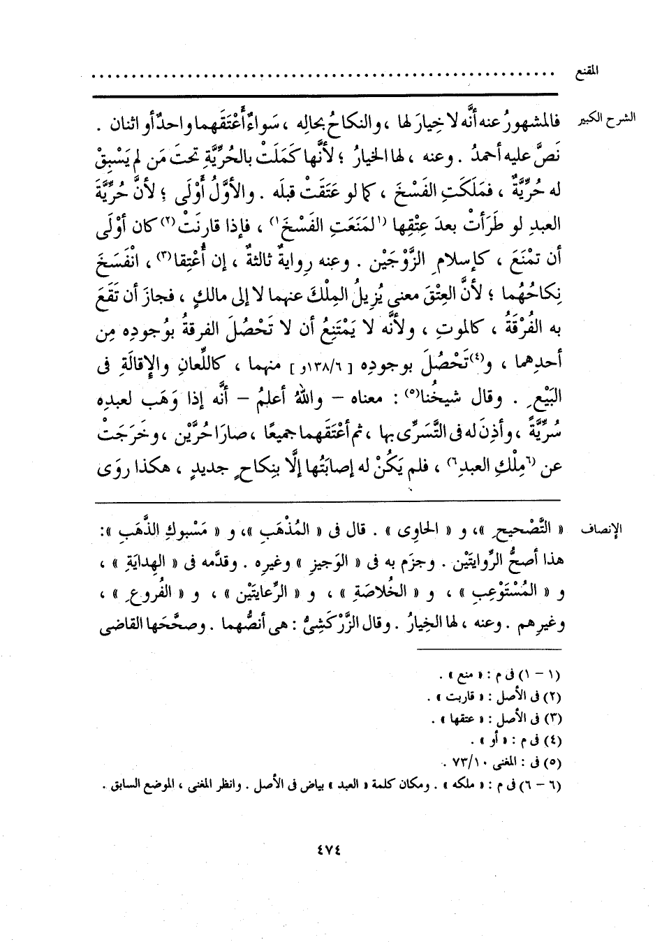 «التَّصْحيحِ»، و «الحاوي». قال في «المُذْهَبِ»، و «مَسْبوكِ الذَّهَبِ»: هذا أصحُّ الرِّوايتَين. وجزَم به في «الوَجيزِ» وغيرِه. وقدَّمه في «الهِدايَةِ»، و «المُسْتَوْعِبِ»، و «الخُلاصَةِ»، و «الرِّعايتَين»، و «الفُروعِ»، وغيرِهم. وعنه، لها الخِيارُ. وقال الزَّرْكَشِيُّ: هي أنصُّهما. وصحَّحَها القاضي
