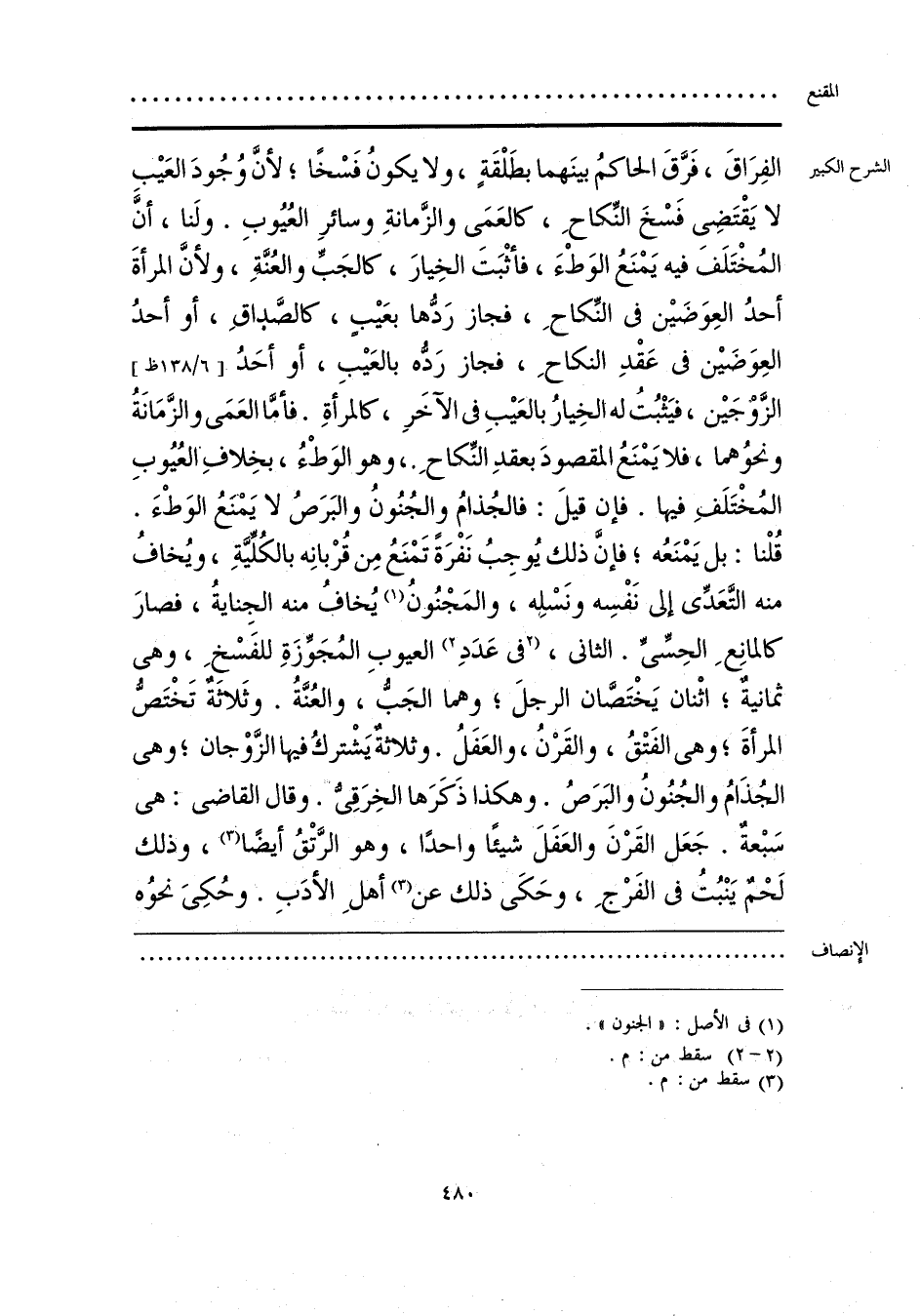 الفِرَاقَ، فَرَّقَ الحاكمُ بينَهما بطَلْقَةٍ، ولا يكونُ فَسْخًا؛ لأنَّ وُجُودَ العَيب لا يَقْتَضِي فَسْخَ النِّكاحِ، كالعَمَى والزَّمانةِ وسائرِ العُيُوبِ. ولَنا، أنَّ المُخْتَلَفَ فيه يَمْنَعُ الوَطْءَ، فأثْبَتَ الخِيارَ، كالجَبِّ والعُنَّةِ، ولأنَّ المرأةَ أحدُ العِوَضَين في النِّكاحِ، فجاز رَدُّها بعَيبٍ، كالصَّداقِ، أو أحدُ العِوَضَين في عَقْدِ النكاحِ، فجاز رَدُّه بالعَيبِ، أو أحَدُ الزَّوْجَين، فيَثْبُتُ له الخِيارُ بالعَيبِ في الآخَرِ، كالمرأةِ. فأمَّا العَمَى والزَّمَانَةُ ونحوُهما، فلا يَمْنَعُ المقصودَ بعقدِ النِّكاحِ، وهو الوَطْءُ، بخِلافِ العُيُوبِ المُخْتَلَفِ فيها. فإن قيلَ: فالجُذامُ والجُنُونُ والبَرَصُ لا يَمْنَعُ الوَطْءَ. قُلْنا: بل يَمْنَعُه؛ فإنَّ ذلك يُوجِبُ نفْرَةً تَمْنَعُ مِن قُرْبانِه بالكُلِّيَّةِ، ويُخافُ منه التَّعَدِّي إلى نَفْسِه ونَسْلِه، والمَجْنُونُ (¬1) يُخافُ منه الجِنايةُ، فصارَ كالمانِعِ الحِسِّيِّ. الثاني، [في عَدَدِ] (¬2) العيوبِ المُجَوِّزَةِ للفَسْخِ، وهي ثمانيةٌ؛ اثْنان يَخْتَصَّان الرجلَ؛ وهما الجَبُّ، والعُنَّةُ. وثَلاثةٌ تَخْتَصُّ المرأةَ؛ وهي الفَتْقُ، والقَرْنُ، والعَفَلُ. وثلاثةٌ يَشْتركُ فيها الزَّوْجان؛ وهي الجُذَامُ والجُنُونُ والبَرَصُ. وهكذا ذَكَرَها الخِرَقِيُّ. وقال القاضي: هي سَبْعةٌ. جَعَل القَرْنَ والعَفَلَ شيئًا واحدًا، وهو الرَّتْقُ أيضًا (3)، وذلك لَحْمٌ يَنْبُتُ في الفَرْجِ، وحَكَى ذلك عن (¬3) أهلِ الأدَبِ. وحُكِيَ نحوُه