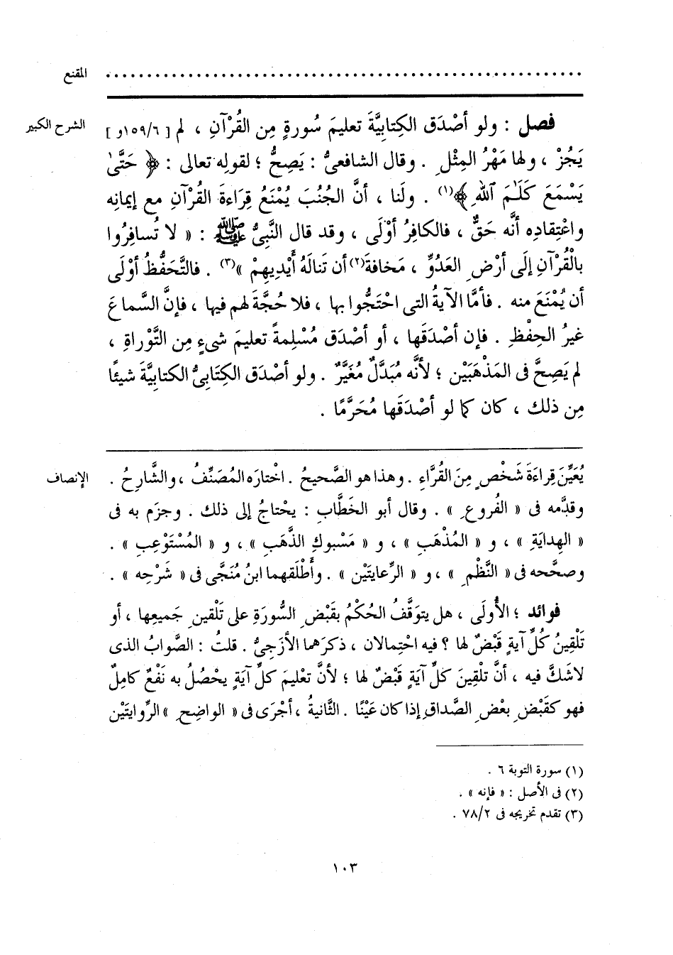 فوائد؛ الأولَى، هل يتوَقَّفُ الحُكْمُ بقَبْضِ السُّورَةِ على تَلْقينِ جَميعِها، أو تَلْقِينُ كُلِّ آيةٍ قَبْضٌ لها؟ فيه احْتِمالان، ذكرَهما الأزَجِيُّ. قلتُ: الصوابُ الذي لا شَكَّ فيه، أنَّ تلْقِينَ كلِّ آيَةٍ قَبْضٌ لها؛ لأنَّ تعْليمَ كلِّ آيَةٍ يحْصُلُ به نَفْعٌ كامِلٌ فهو كقَبْضِ بعْضِ الصَّداقِ إذا كان عَينًا. الثَّانيةُ، أجْرَى في «الواضحِ» الرِّوايتَين