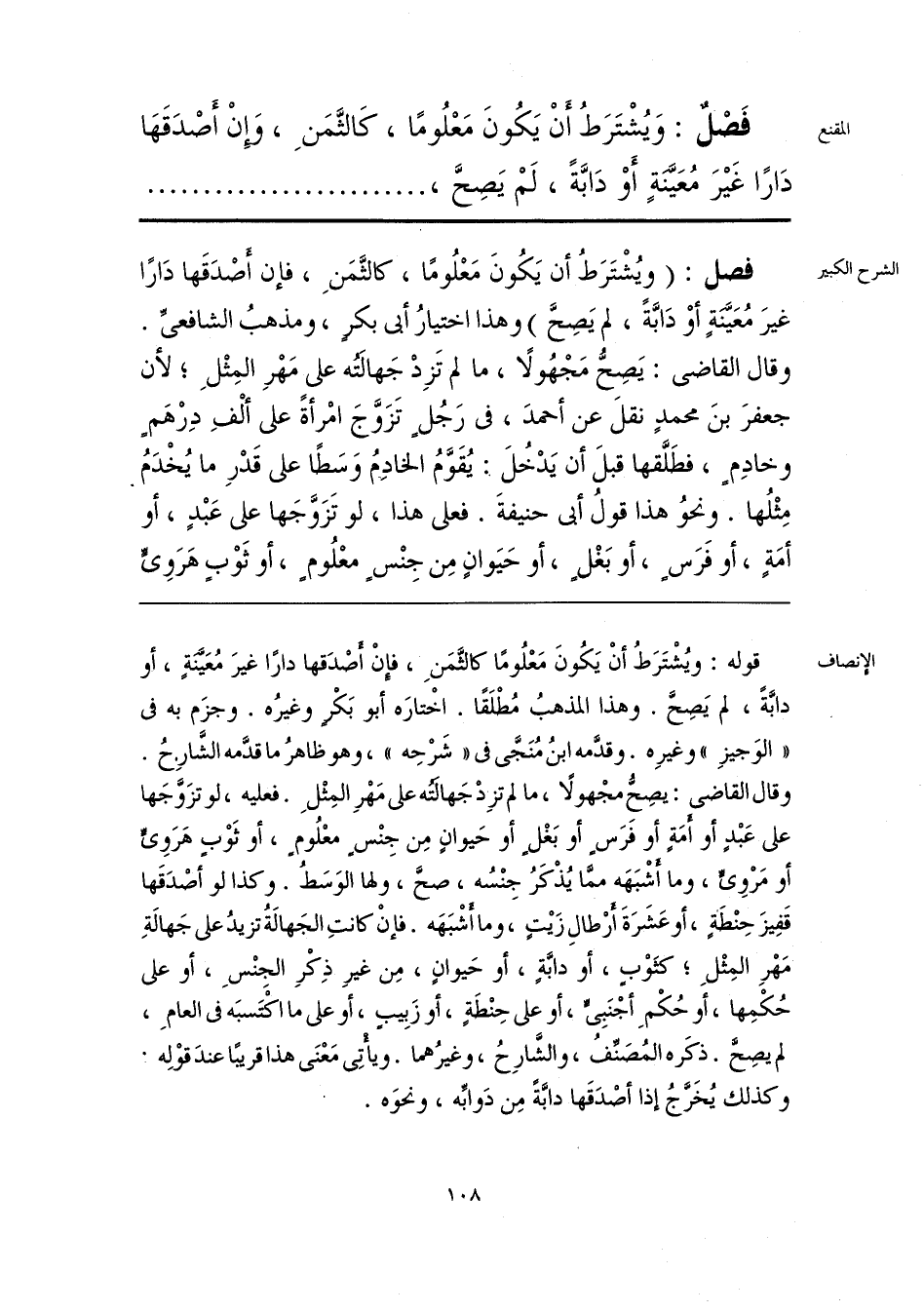 قوله: ويُشْتَرَطُ أنْ يَكُونَ مَعْلُومًا كالثَّمَنِ، فإنْ أصْدَقها دارًا غيرَ مُعَيَنَةٍ، أو دابَّةً، لم يَصِحَّ. وهذا المذهبُ مُطْلَقًا. اخْتارَه أبو بَكْر وغيرُه. وجزَم به في «الوَجيزِ» وغيرِه. وقدَّمه ابنُ مُنَجَّى في «شَرْحِه»، وهو ظاهرُ ما قدَّمه الشَّارحُ. وقال القاضي: يصِحُّ مجْهولًا، ما لم تزِدْ جَهالتُه على مَهْرِ المِثْلِ. فعليه، لو تزَوَّجَها على عَبْدٍ أو أمَةٍ أو فرَسٍ أو بَغْلٍ أو حَيوانٍ مِن جِنْس معْلُوم، أو ثَوْبٍ هَرَويٍّ أو مَرْويٍّ، وما أَشْبَهَه ممَّا يُذْكَرُ جِنْسُه، صحَّ، ولها الوَسَطُ. وكذا لو أصْدَقَها قَفِيزَ حِنْطَةٍ، أو عَشَرَةَ أرْطالِ زَيتٍ، وما أشْبَهَه. فإنْ كانتِ الجَهالةُ تزيدُ على جَهالةِ مَهْرِ المِثْلِ؛ كثَوْبٍ، أو دابَّةٍ، أو حَيوانٍ، مِن غيرِ ذِكْرِ الجِنْسِ، أو على حُكْمِها، أو حُكْمِ أجْنَبِيٍّ، أو على حِنْطَةٍ، أو زَبِيبٍ، أو على ما اكْتَسبَه في العامِ، لم يصِحَّ. ذكَره المُصَنِّفُ، والشَّارِحُ، وغيرُهما. ويأْتِي مَعْنَى هذا قريبًا عندَ قوْلِه وكذلك يُخَرَّجُ إذا أصْدَقَها دابَّةً مِن دَوابِّه، ونحوَه.